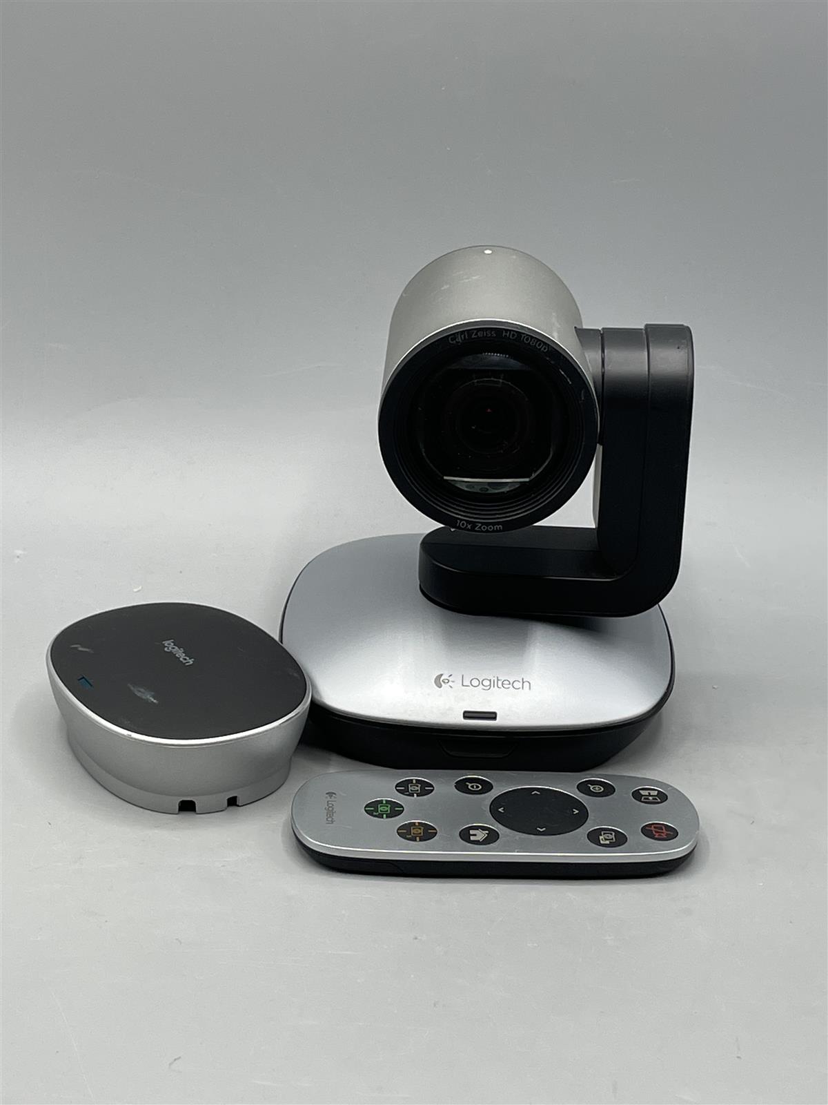 Logitech Full HD PTZ Pro-kamera web-kamera, jossa on Carl Zeiss -linssi ja 10x zoom. Mukana kaukosäädin ja liitäntälaite, virtalähde.