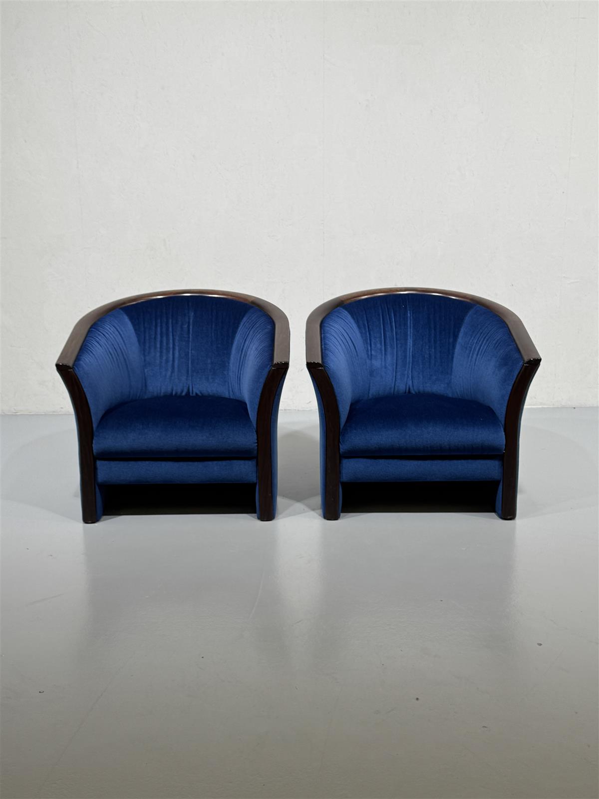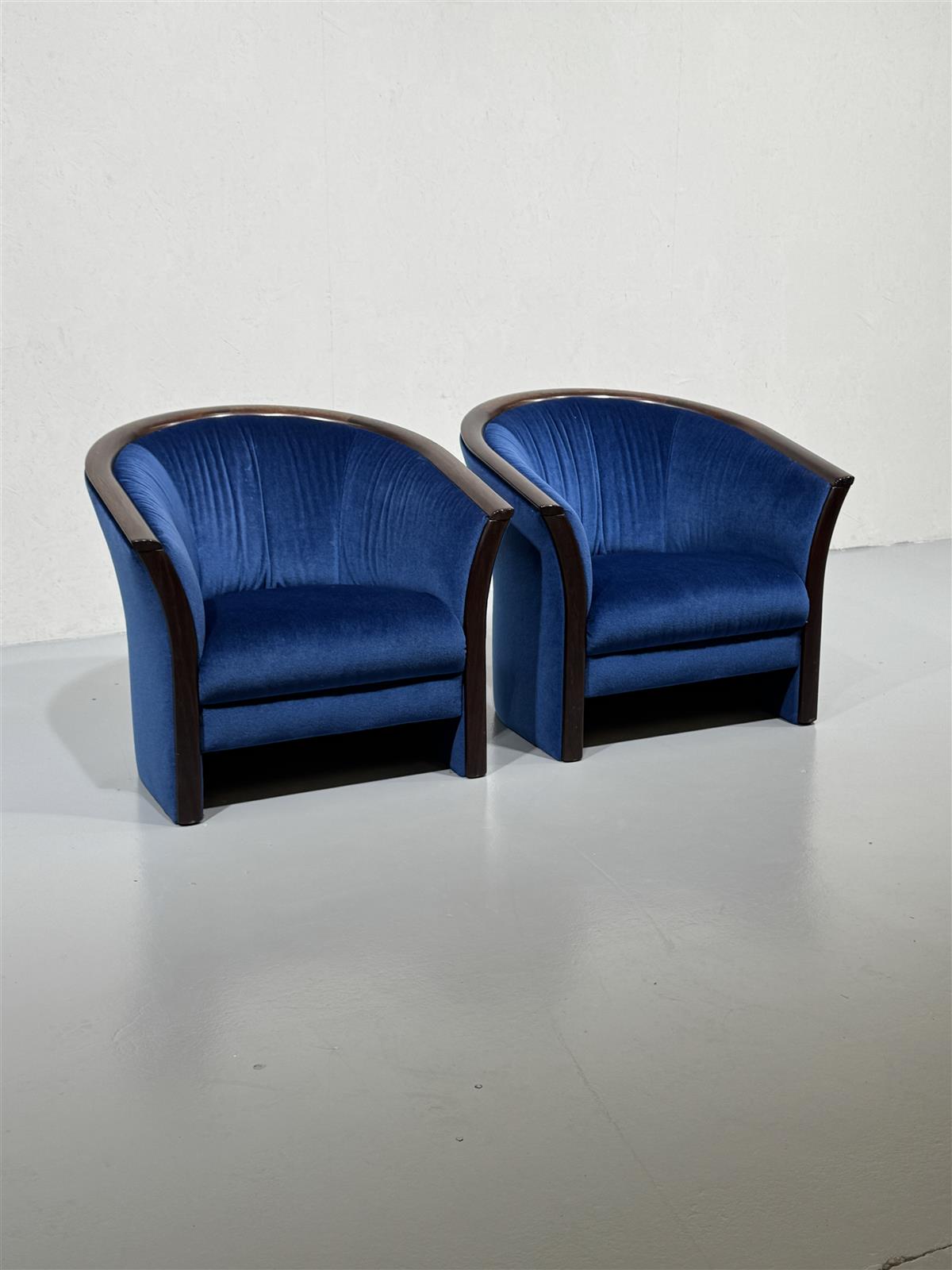 Tyylikkäät Loveseat henkiset, kaarevat nojatuolit, joissa on syvän sininen samettiverhoilu ja tummat puukäsinojat. Näissä tuoleissa on mukava istua ja ne tuovat tilaan näyttävyyttä ja väriä. Sopivat hyvin olohuoneeseen tai mihin tahansa tilaan, jossa halutaan yhdistää mukavuus ja tyyli. Istuinkorkeus 41cm.