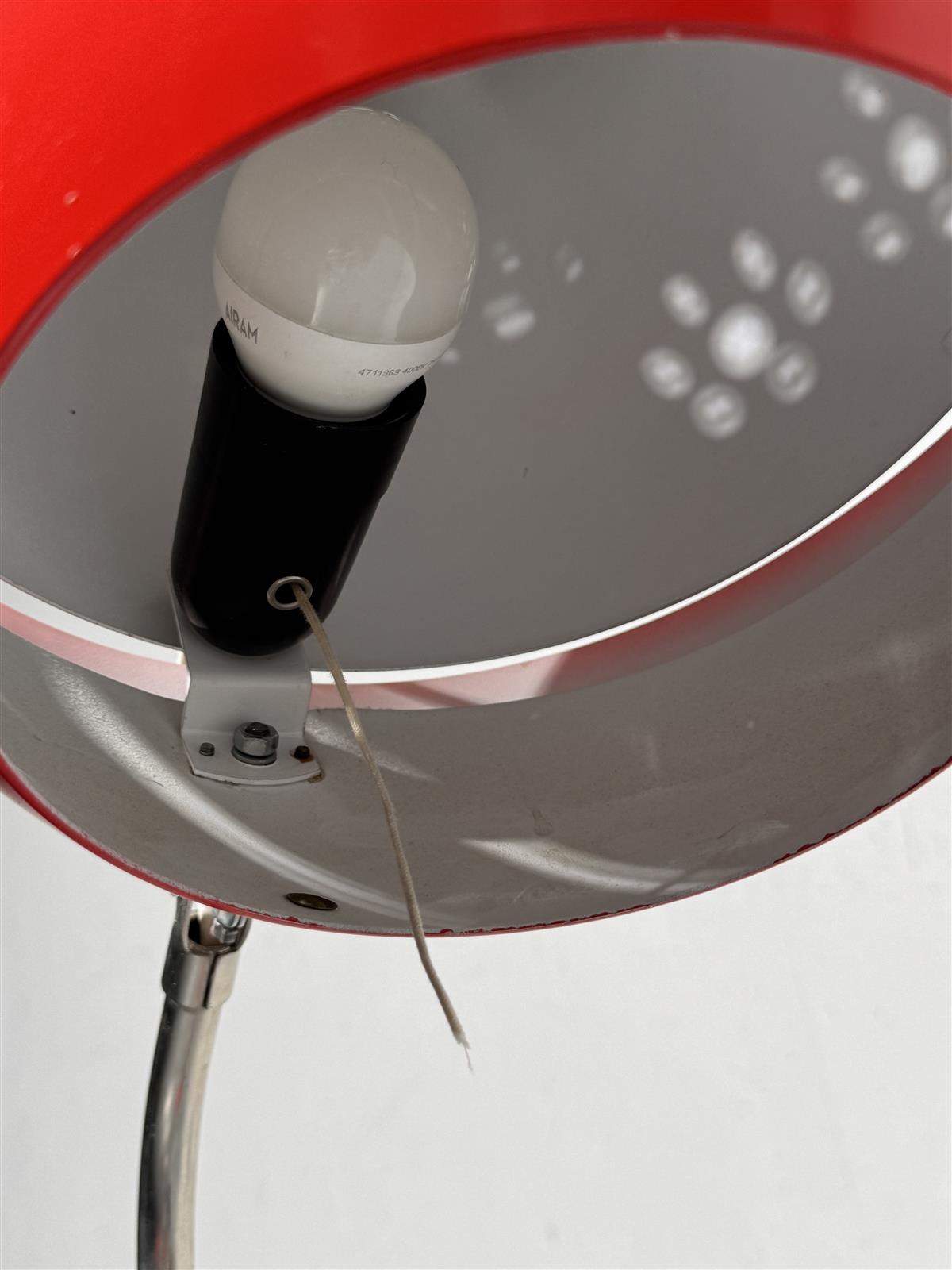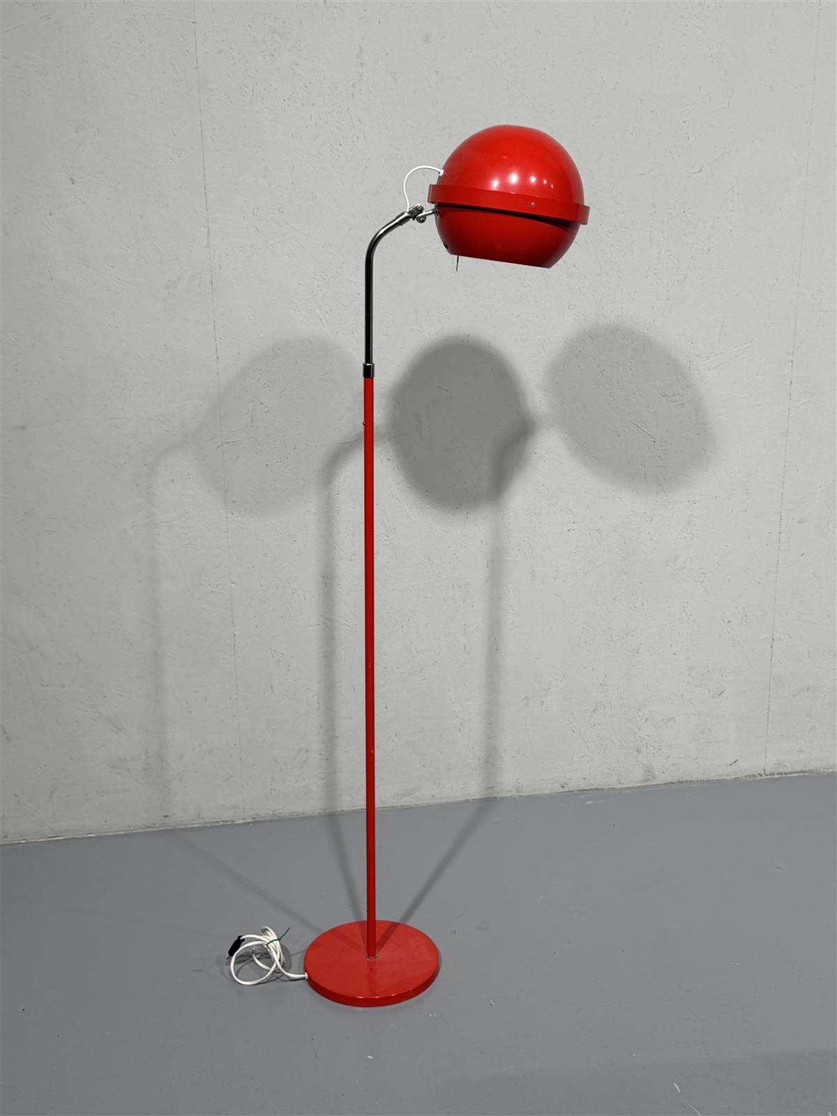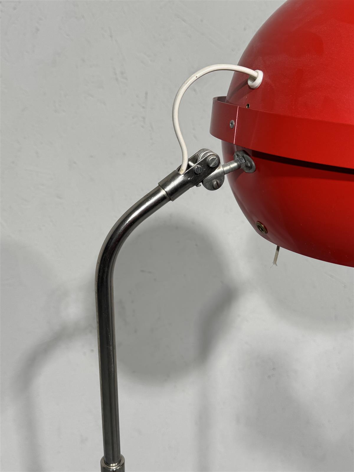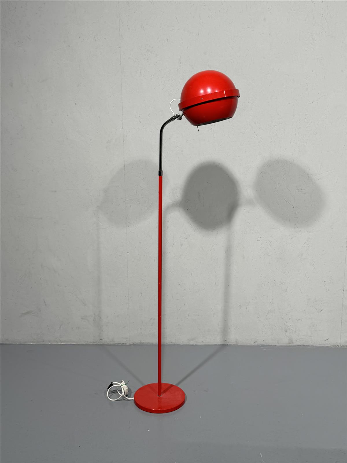 Punainen upean retro Luxoma-lattiavalaisin, jossa on pyöreä pallomainen ”Eye-ball” varjostin ja metallinen varsi, jossa nivel. Valaisimen muotoilu on selkeä ja moderni, mikä tekee siitä erottuvan sisustuselementin. Narukatkaisimesta puuttuu muoviosa, toimiva.