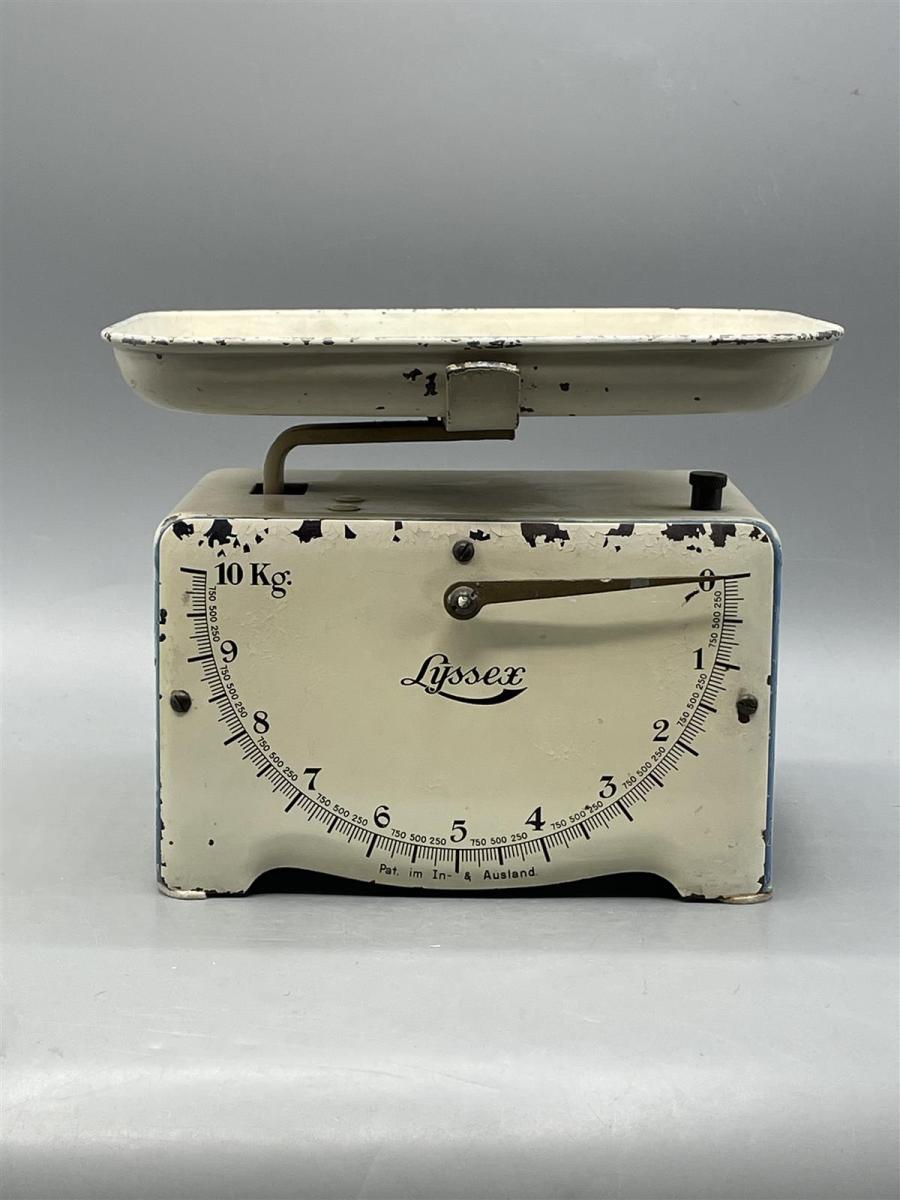 Lyssex-merkkinen vintage vaaka, joka pystyy mittaamaan enintään 10 kg. Vaaka edustaa vintage-tyyliä, joka on suosittu sisustuselementti. Se tuo mieleen menneiden vuosikymmenten estetiikan.