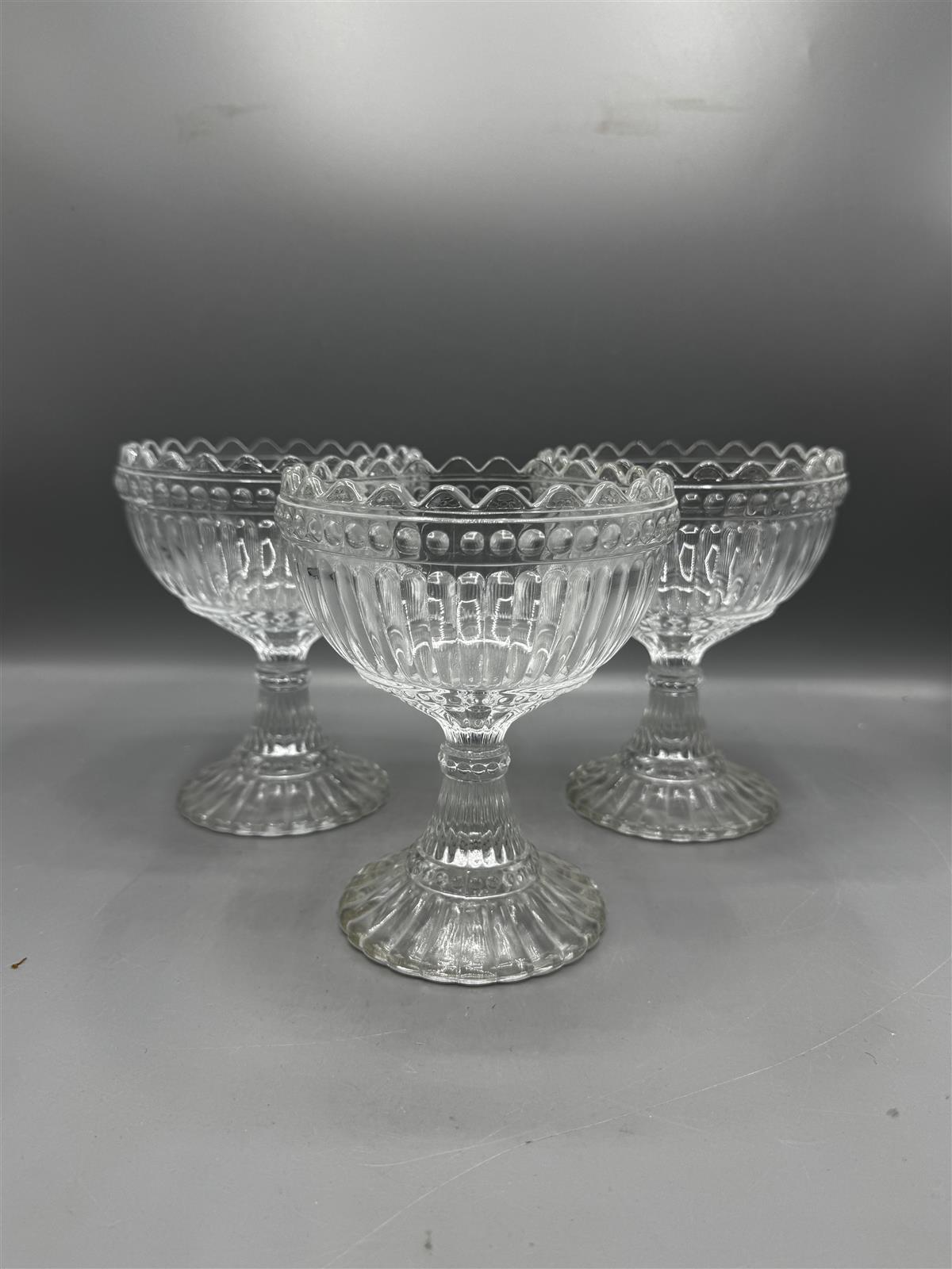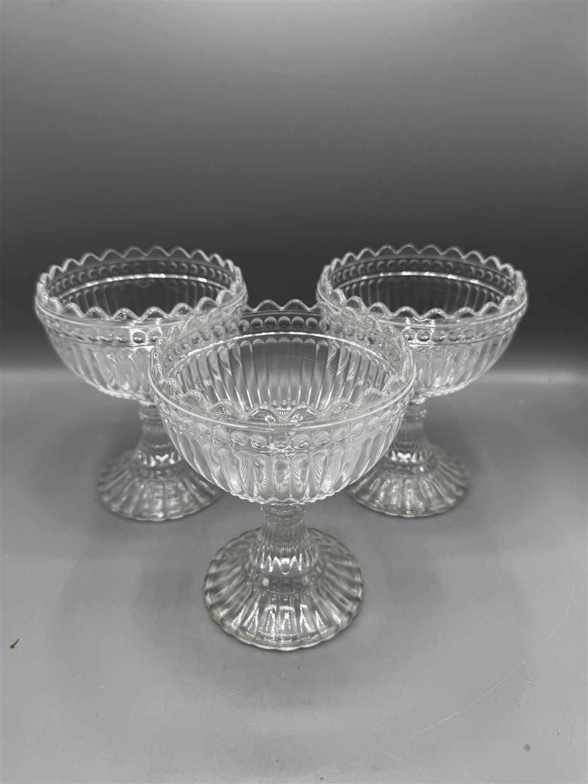Kolme kirkasta Mariskooli 155mm kulhoa, joissa on koristeellinen kuviointi. Kulhot ovat jalallisia ja niissä on aaltoileva reuna. Valmistaja on Marimekko, mikä on merkitty kulhojen pohjaan.