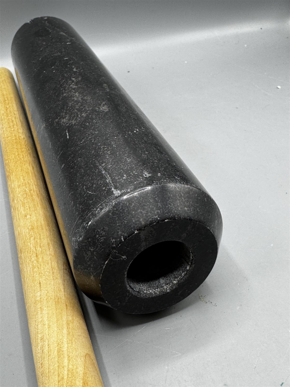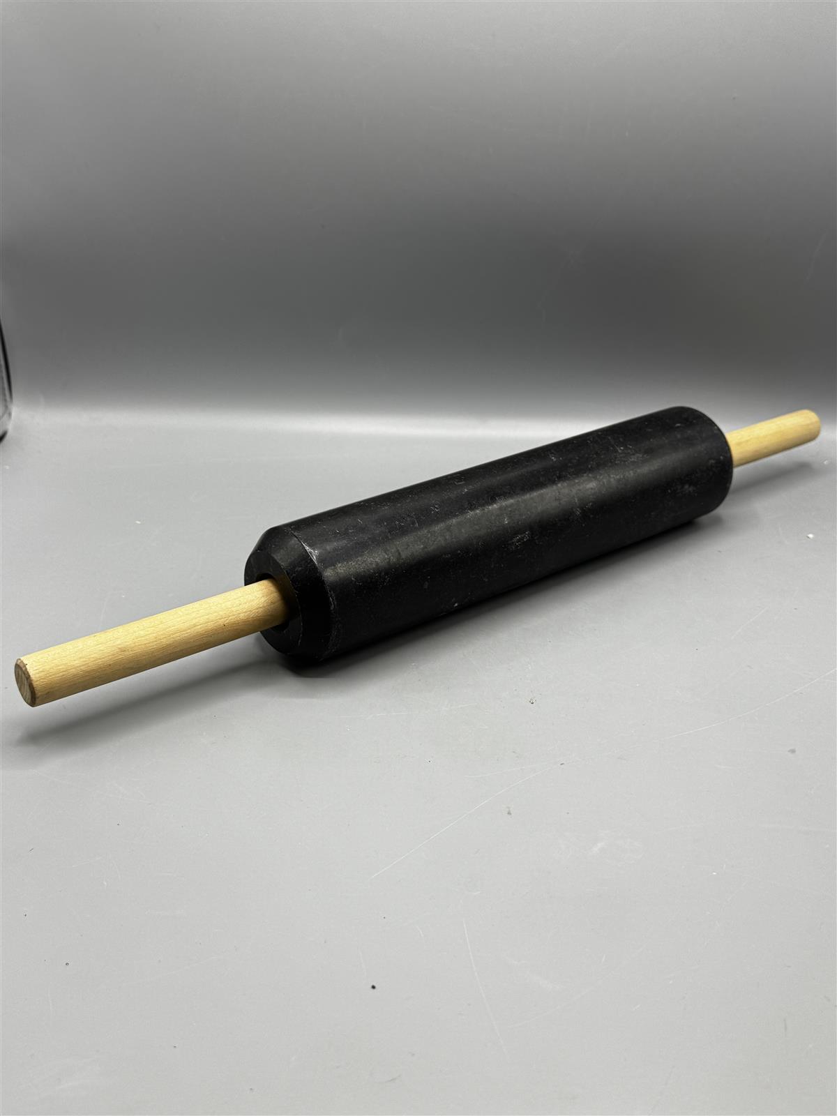 Marmorikaulin, jossa on musta kivirulla ja vaalea, irrallinen puukahva. Rulla on irrotettavissa kahvasta, mikä helpottaa puhdistusta ja säilytystä. Varren kanssa 50cm leveä.