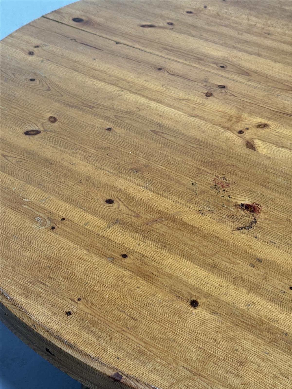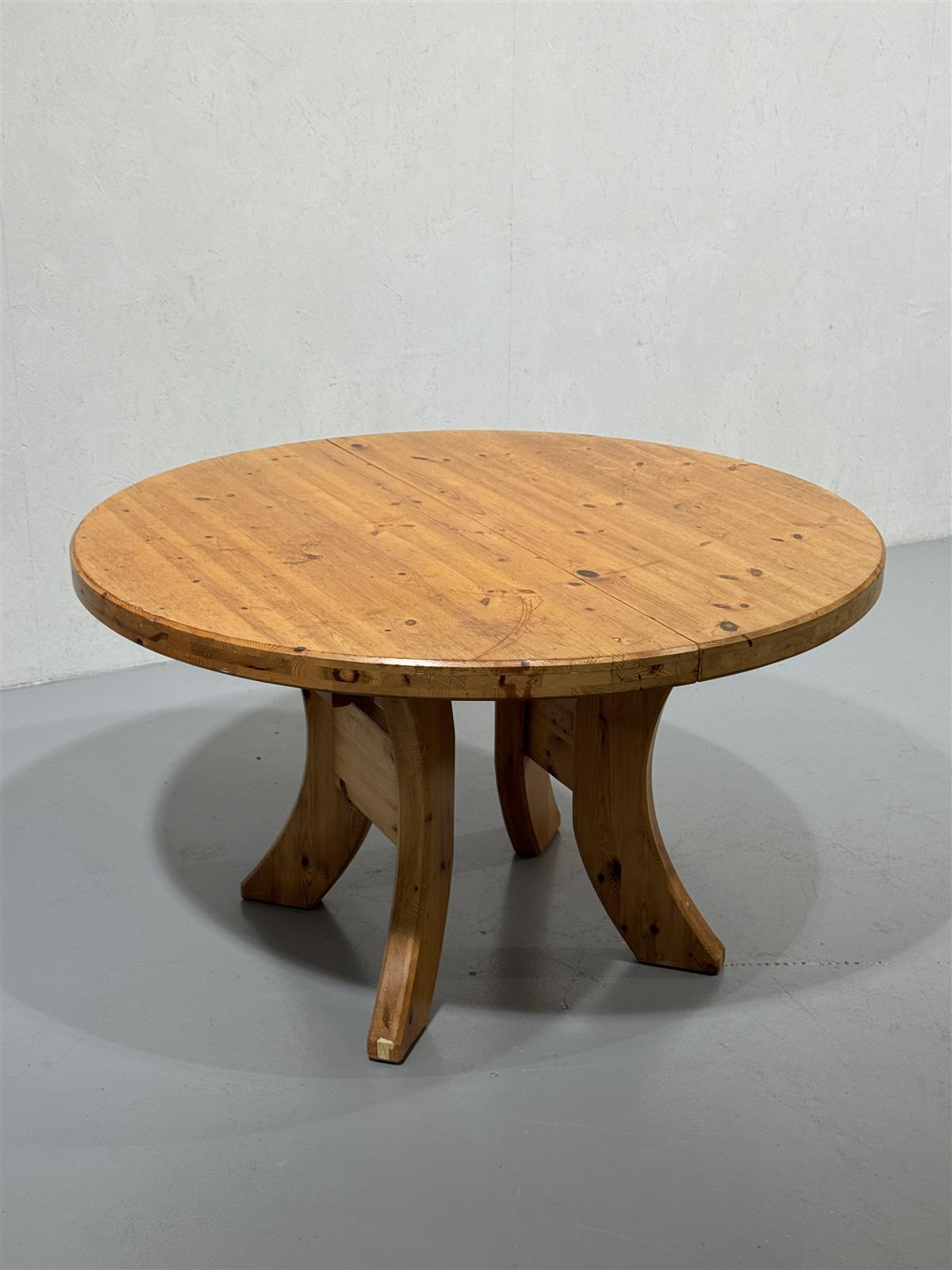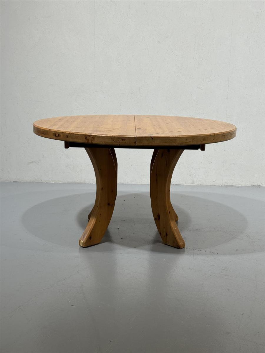 Pyöreä ruokapöytä, joka on valmistettu paksusta mäntypuusta. Pöydässä on kaarevat jalat, jotka antavat sille tukevan rakenteen.