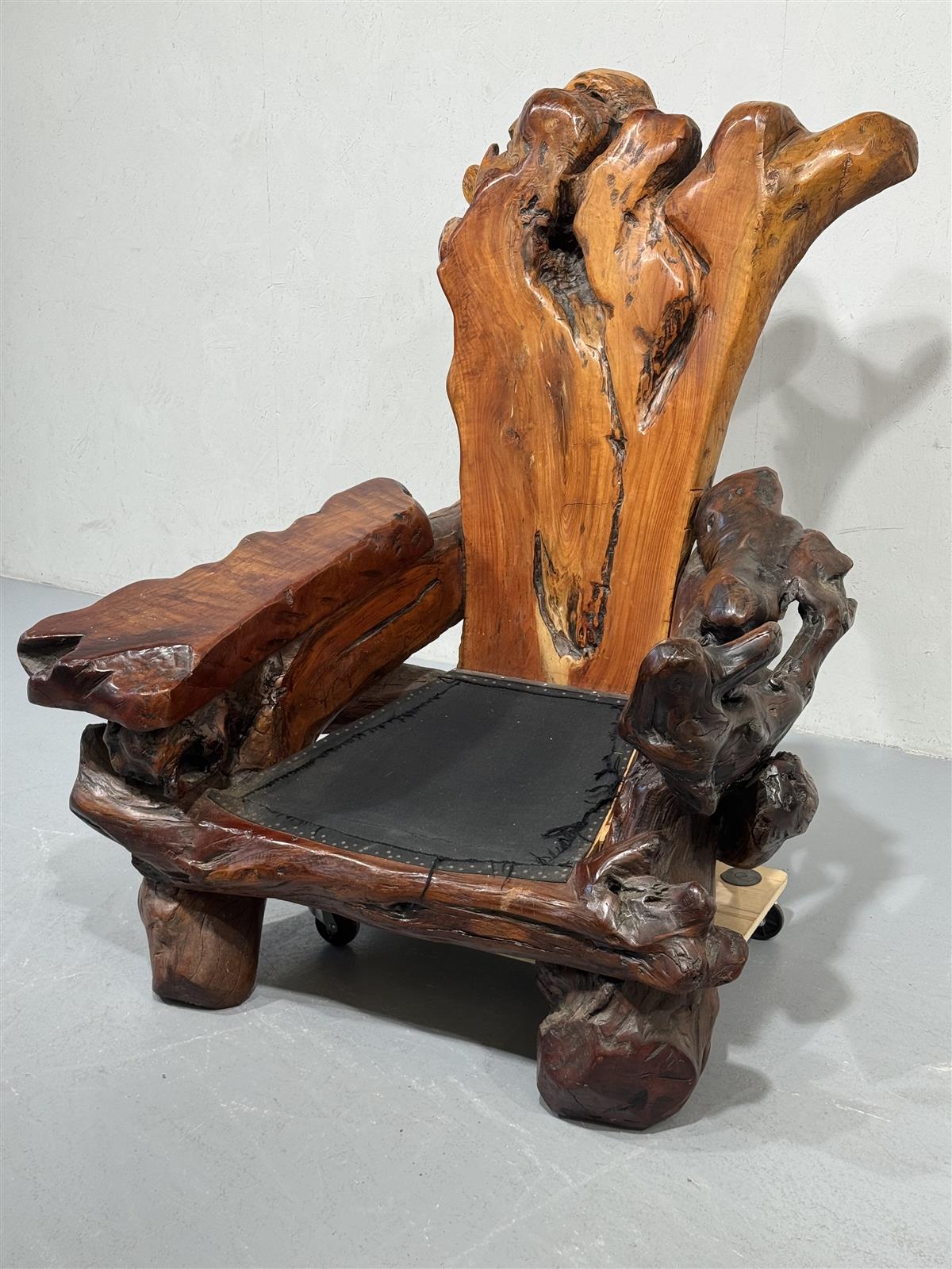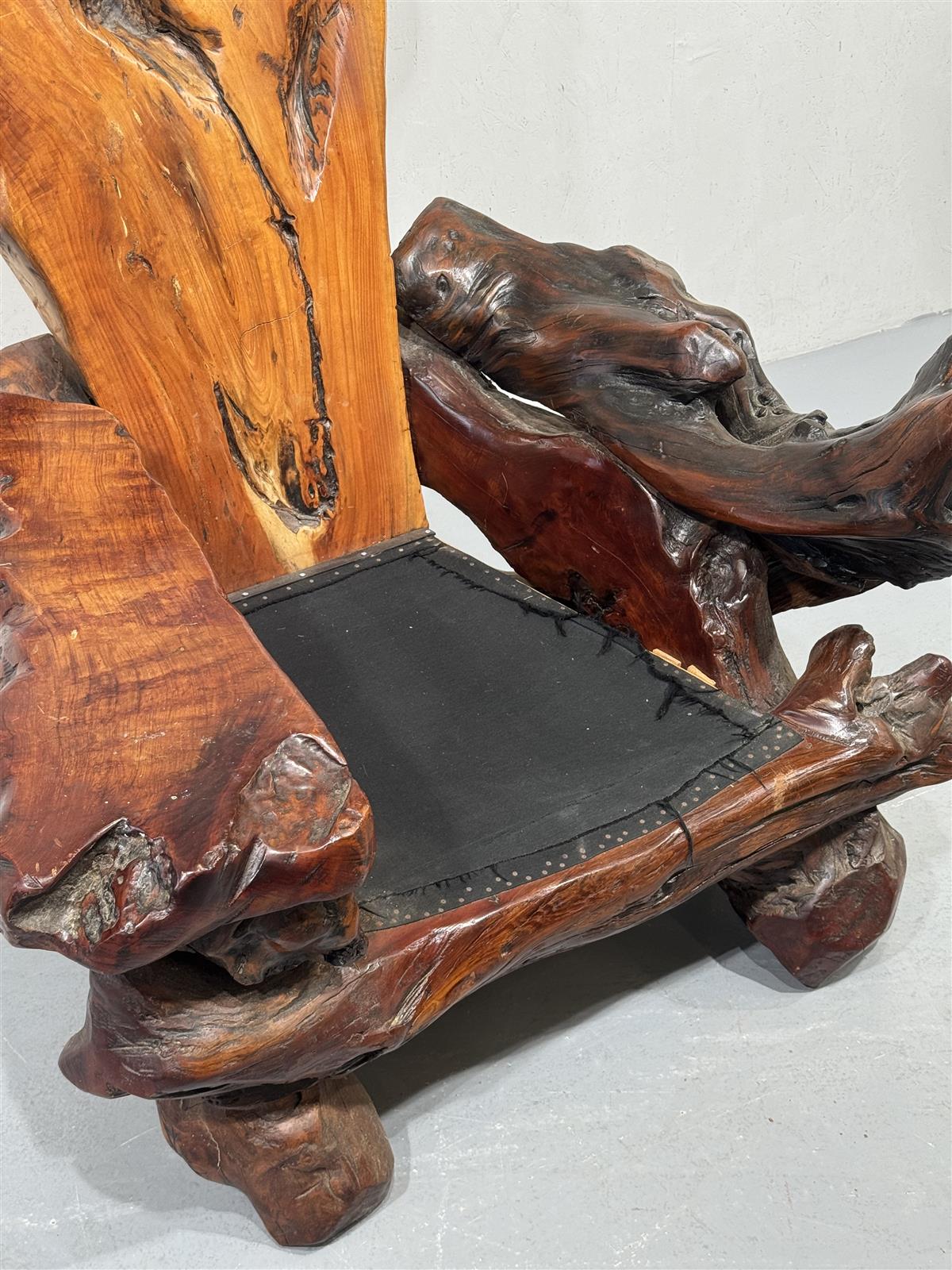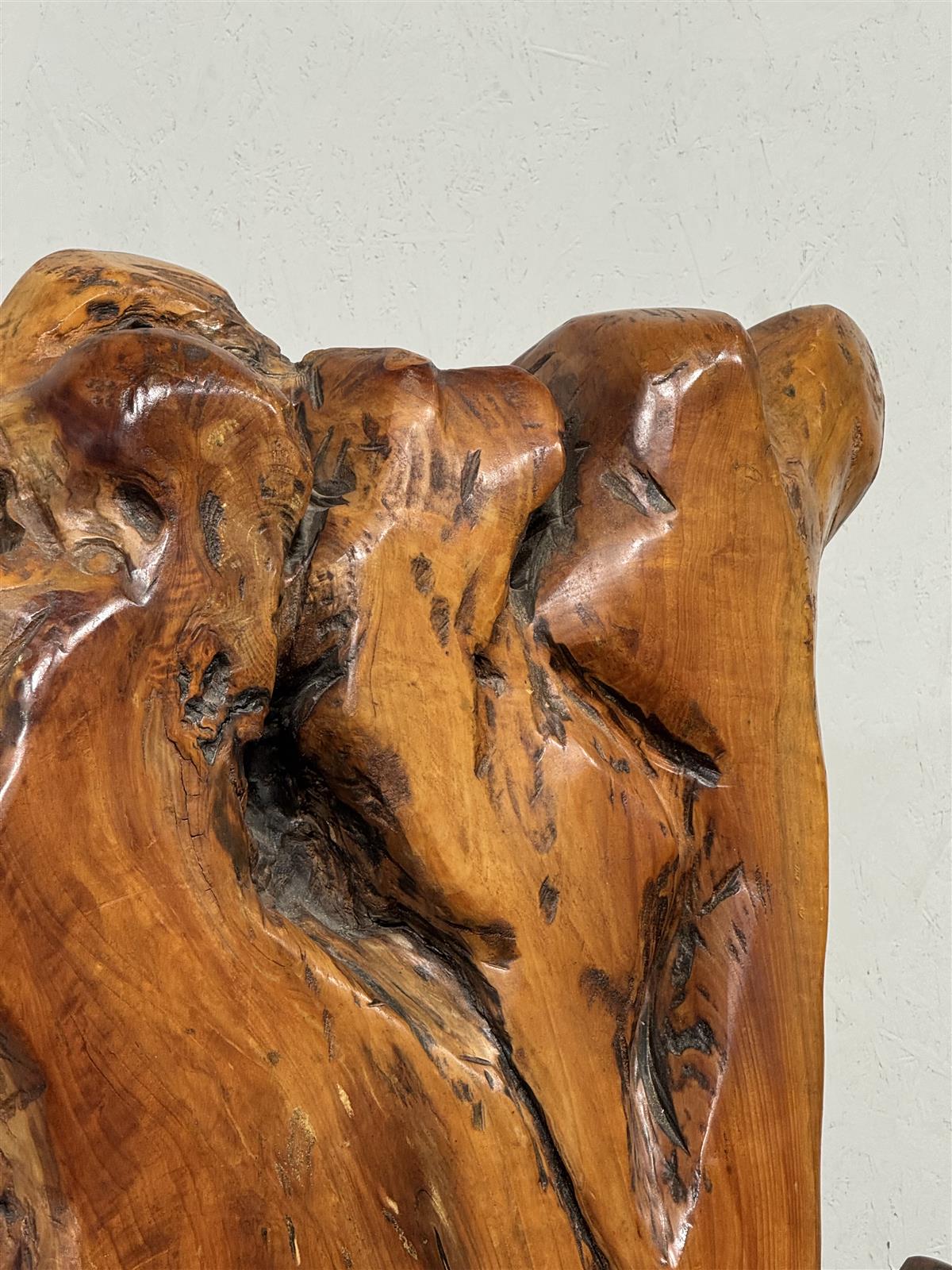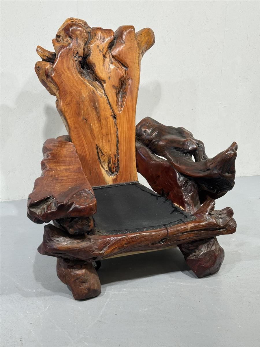 Käsin veistetty, ainutlaatuinen massiivipuu nojatuoli. Valmistettu yhdestä suuresta puun juurakosta, joka on muotoiltu orgaanisesti istuimen, käsinojien ja selkänojan muotoihin. Jokainen yksityiskohta on uniikki ja korostaa puun luonnollista muotoa.
