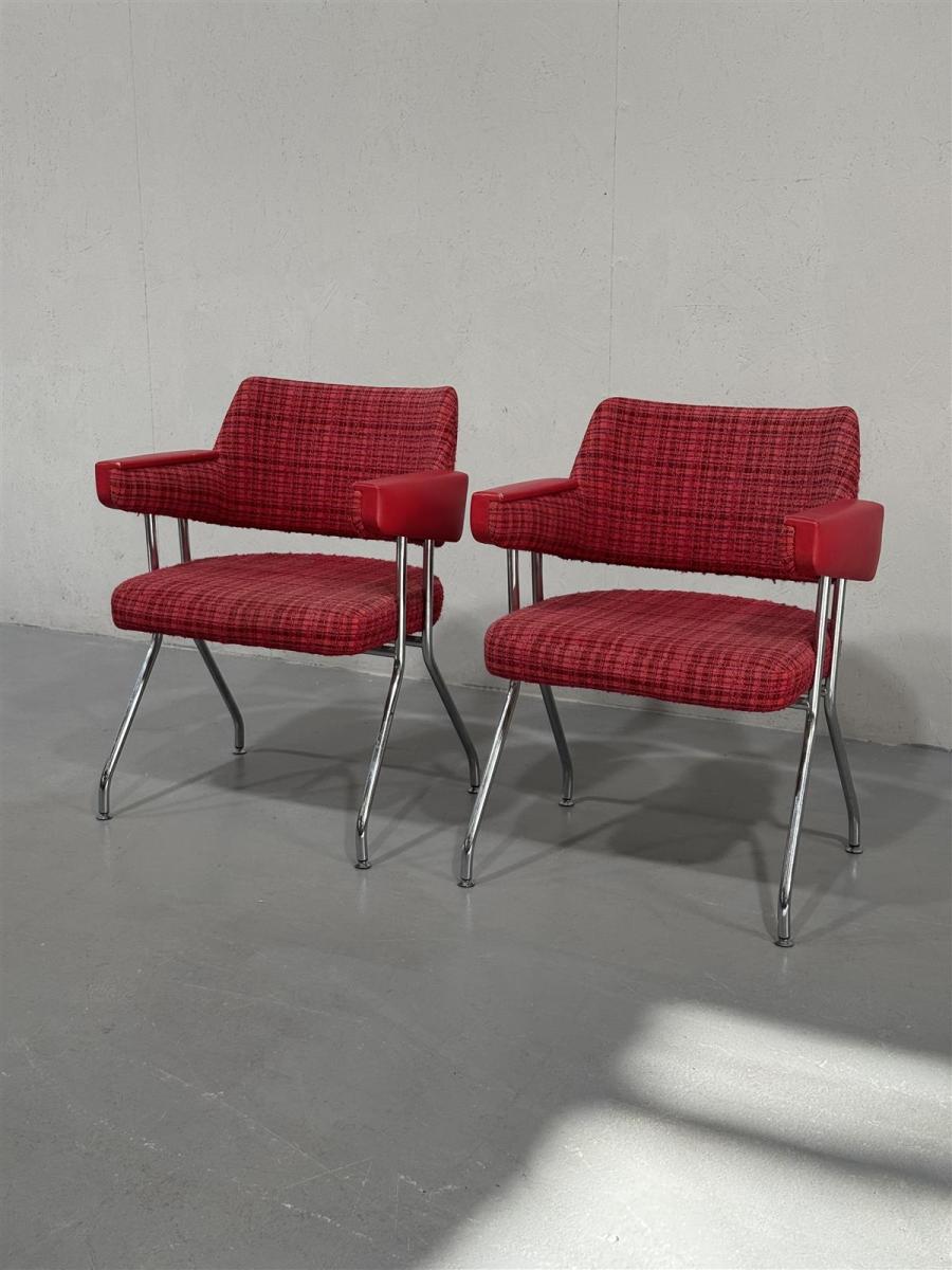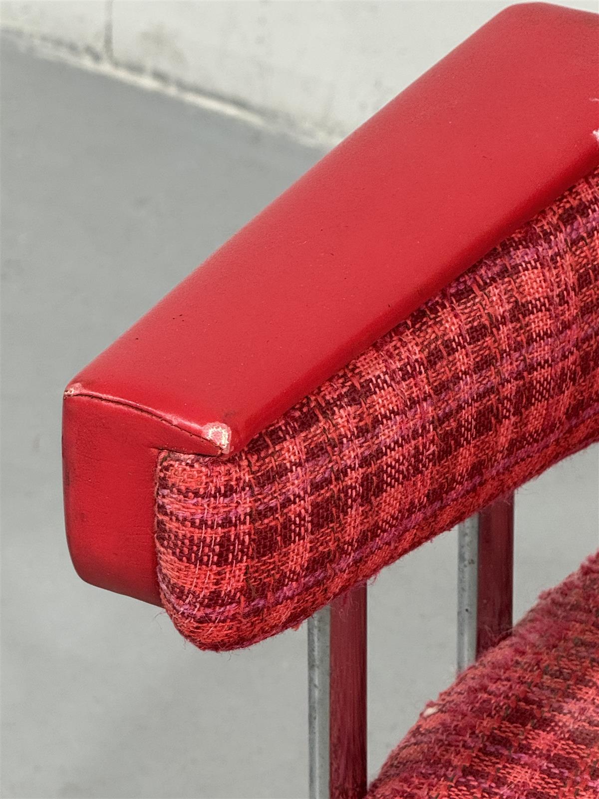 Aarne Ervin suunnittelemat punaisen väriset Merivaara-tuolit, joissa on metallijalat ja verhoiltu istuin.