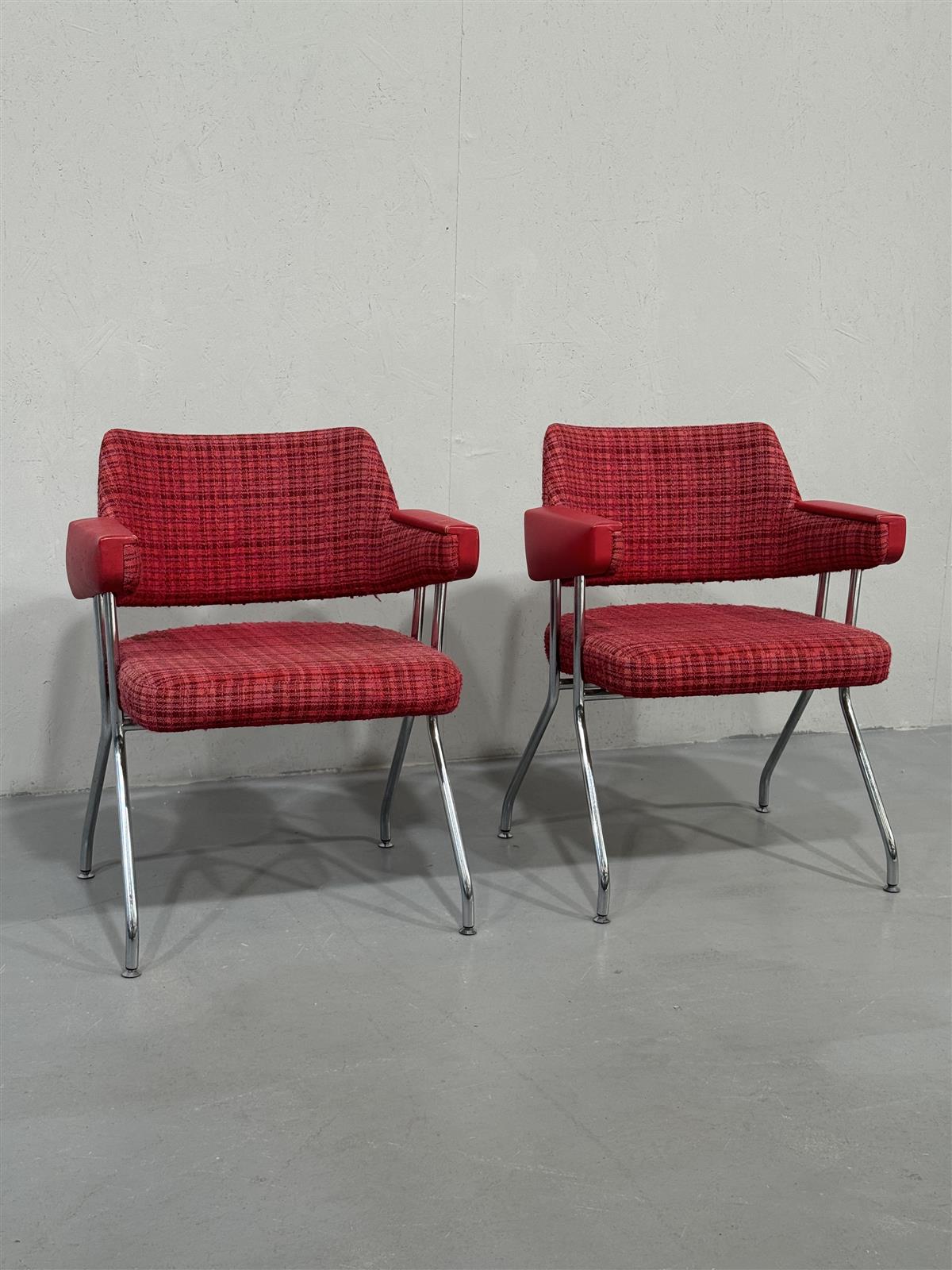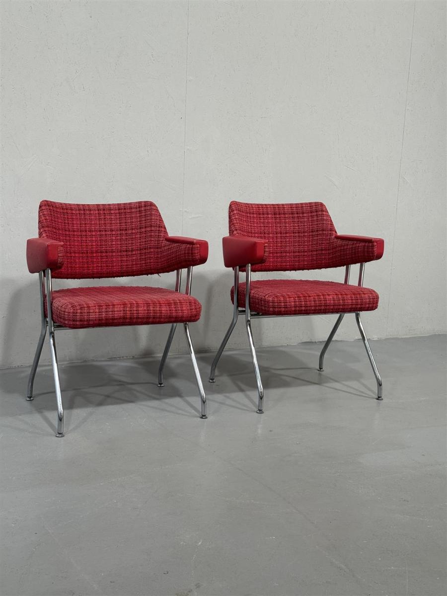 Aarne Ervin suunnittelemat punaiset Merivaara-tuolit, joissa on metallijalat ja verhoiltu punaistuin hienoilla nahka käsinojilla. Kuntohuomio huomioitu hinnassa