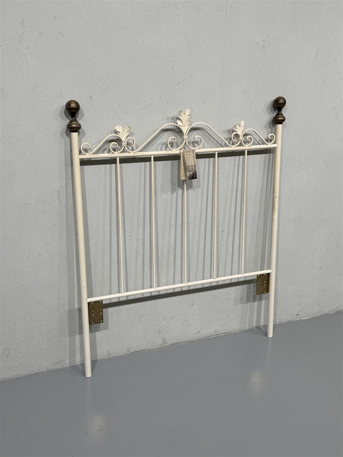 Metallinen sängynpääty, jossa on koristeellisia yksityiskohtia ja tummat päätynupit. Valmistaja Messin. Valkoinen väri antaa sille kevyen ja ilmavan ilmeen. Sopii erinomaisesti romanttiseen tai vintage-tyyliseen sisustukseen. Leveys 108cm korkeus 130cm ja päädyssä valmiit kiinnikepaikat sängyn runkoa varten.