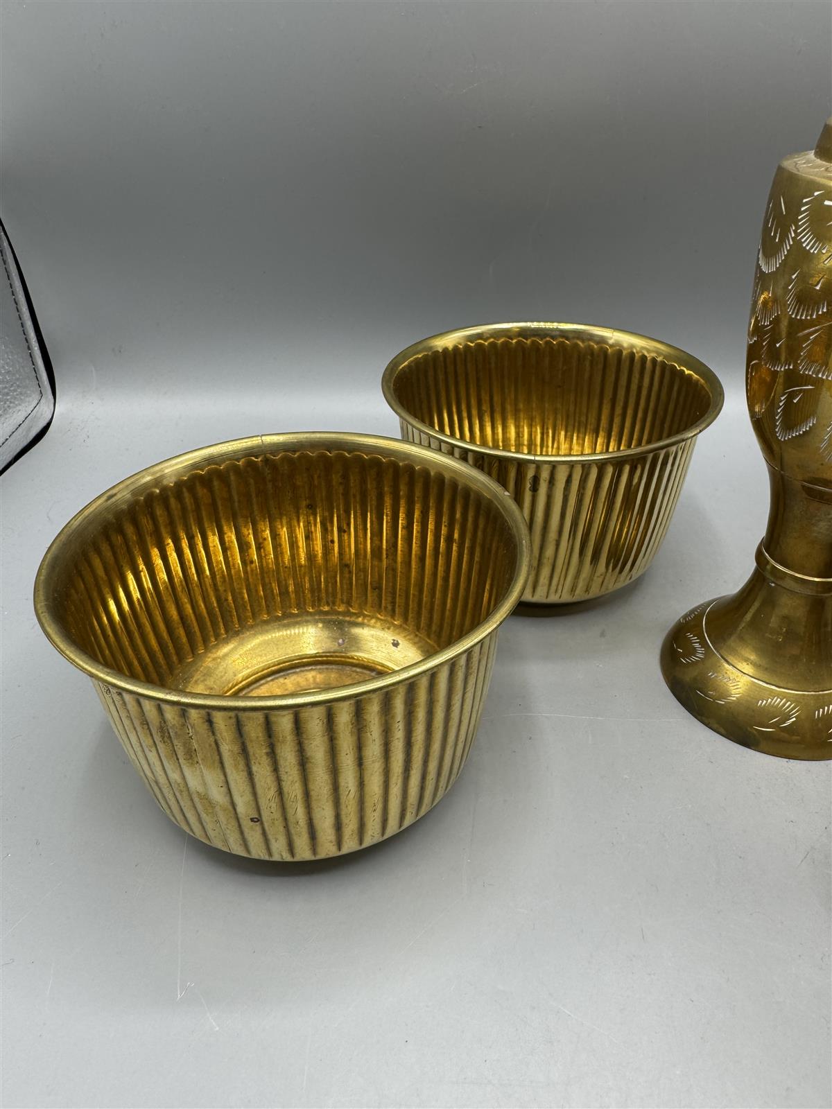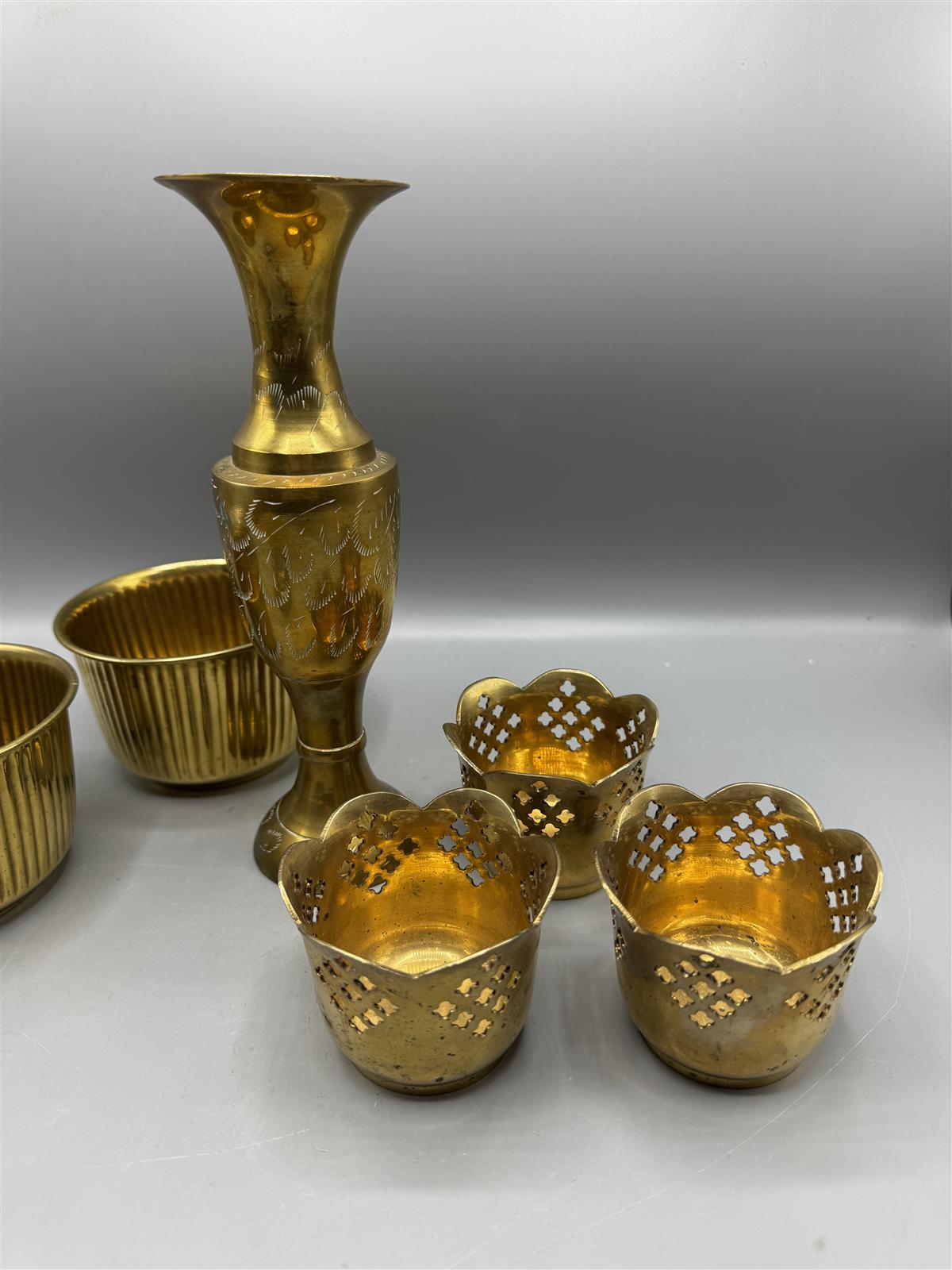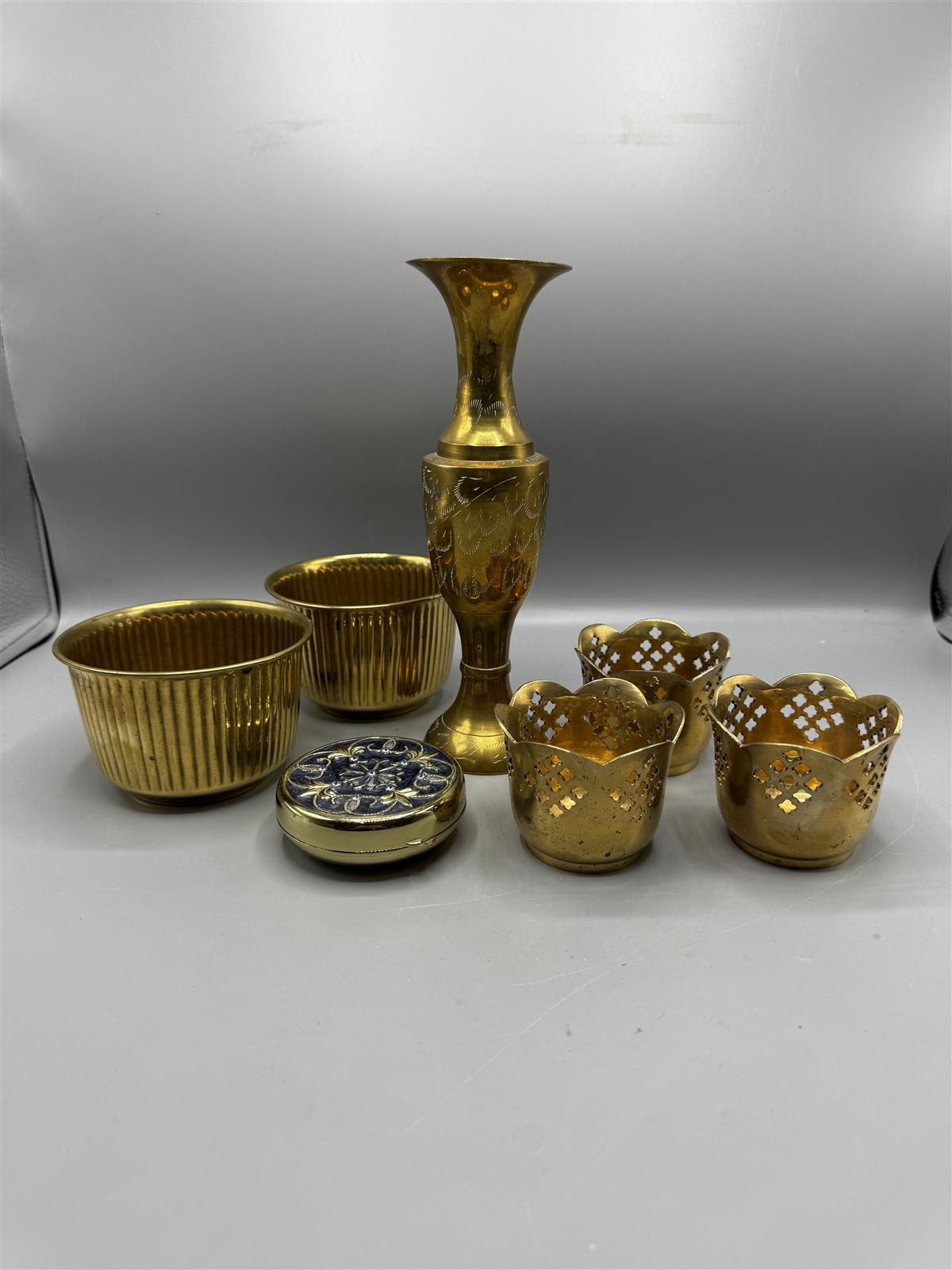 Kokoelma messinkisiä koriste-esineitä, jotka sisältävät maljakon, kaksi kulhoa, kolme tuikku kynttiläpidikettä ja pienen ihanan korurasian. Esineet ovat yksityiskohtaisesti kaiverrettuja ja niissä on koristeellisia kuvioita.