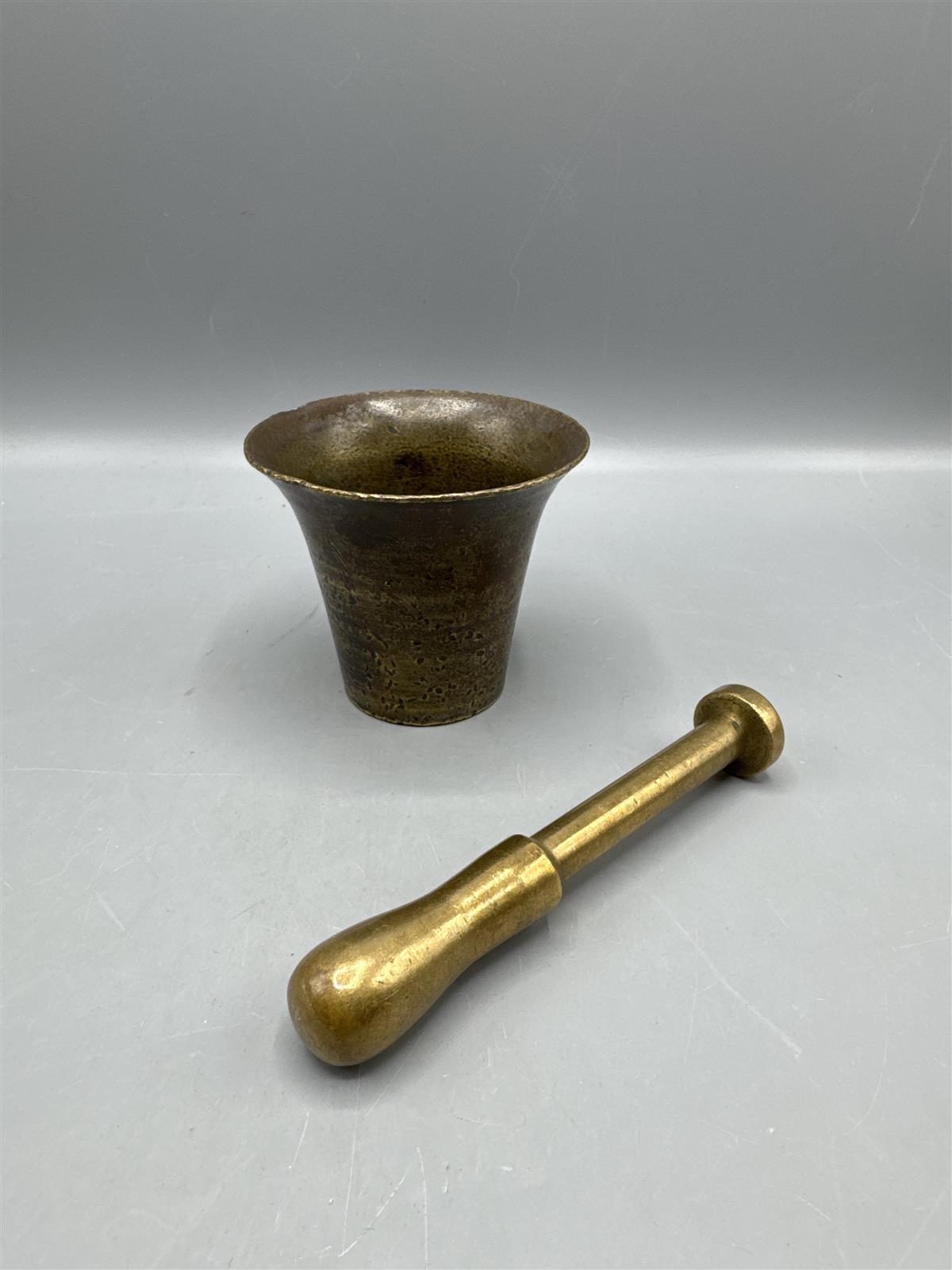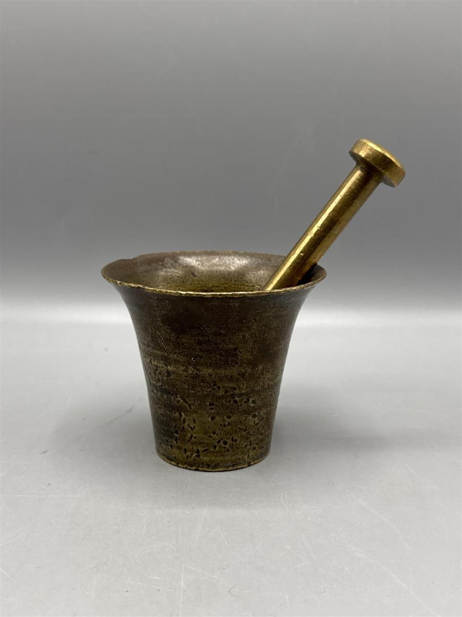 Messinkinen mortteli ja survin. Maustemorttelin sisäosa on sileä ja ulkopinta on hieman patinoitunut.