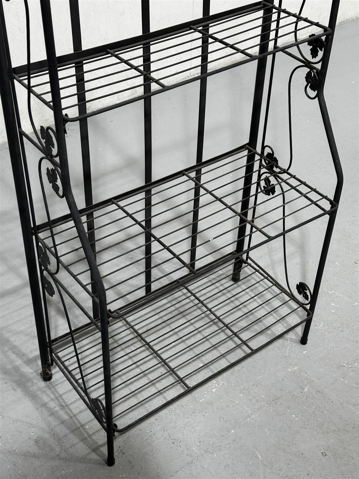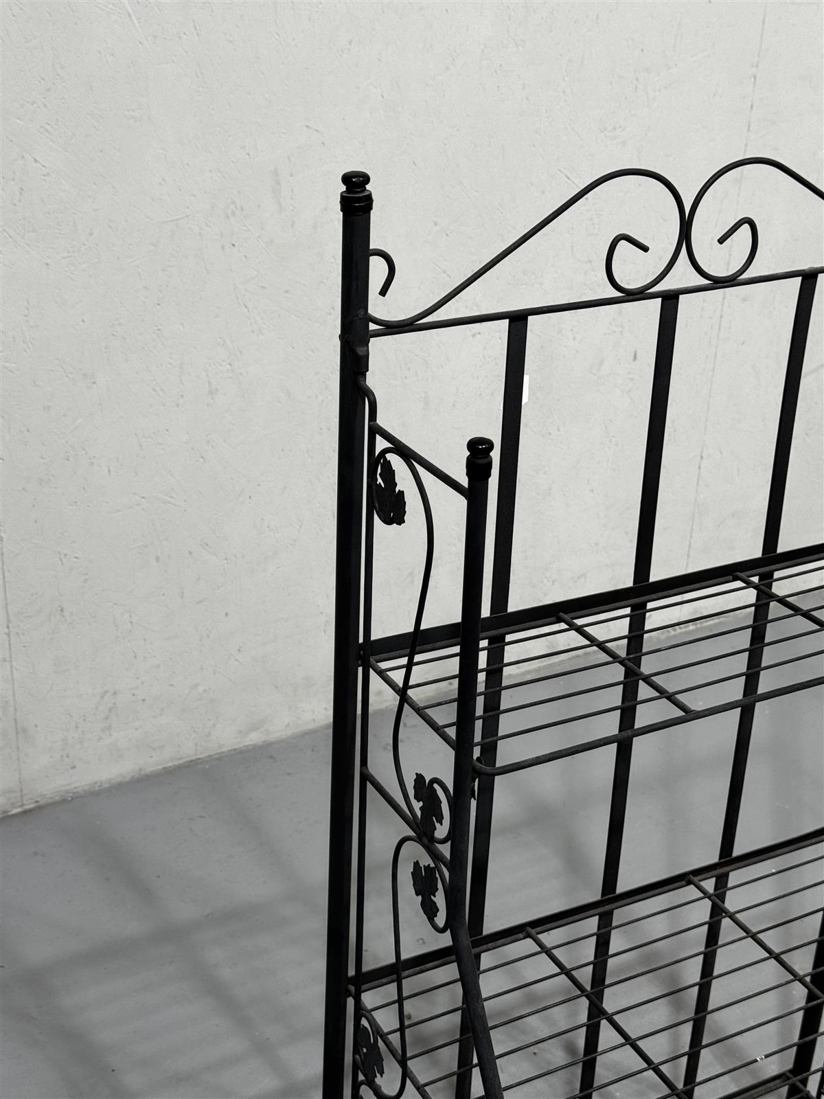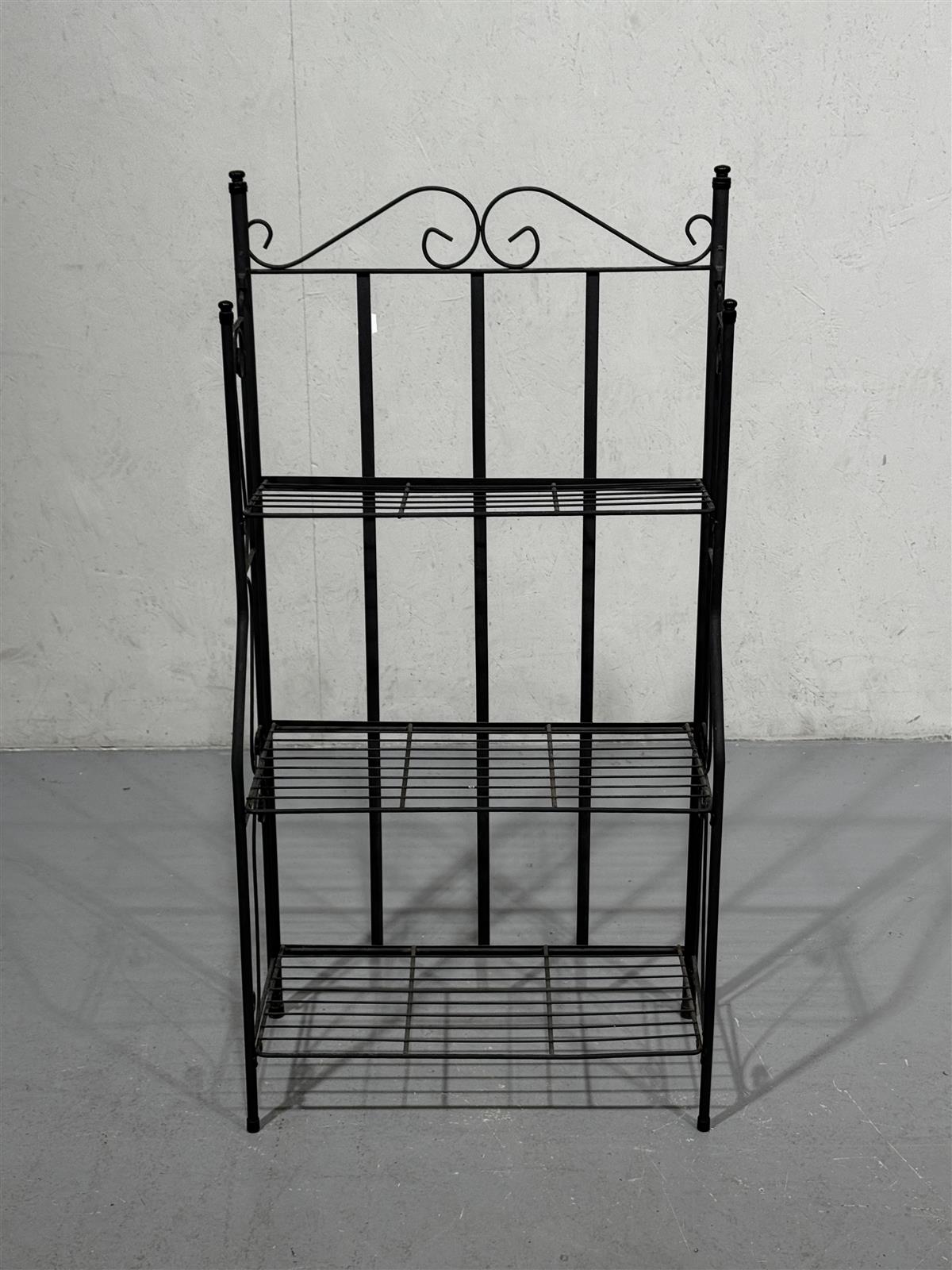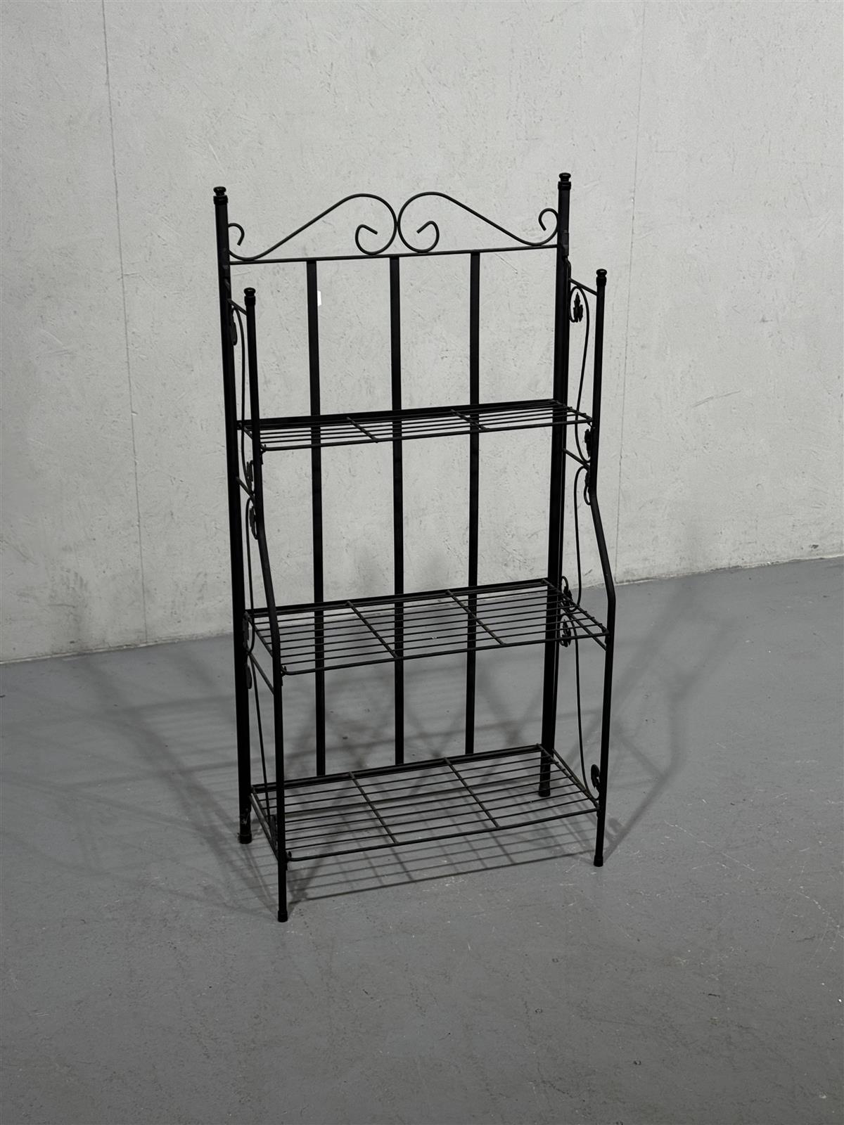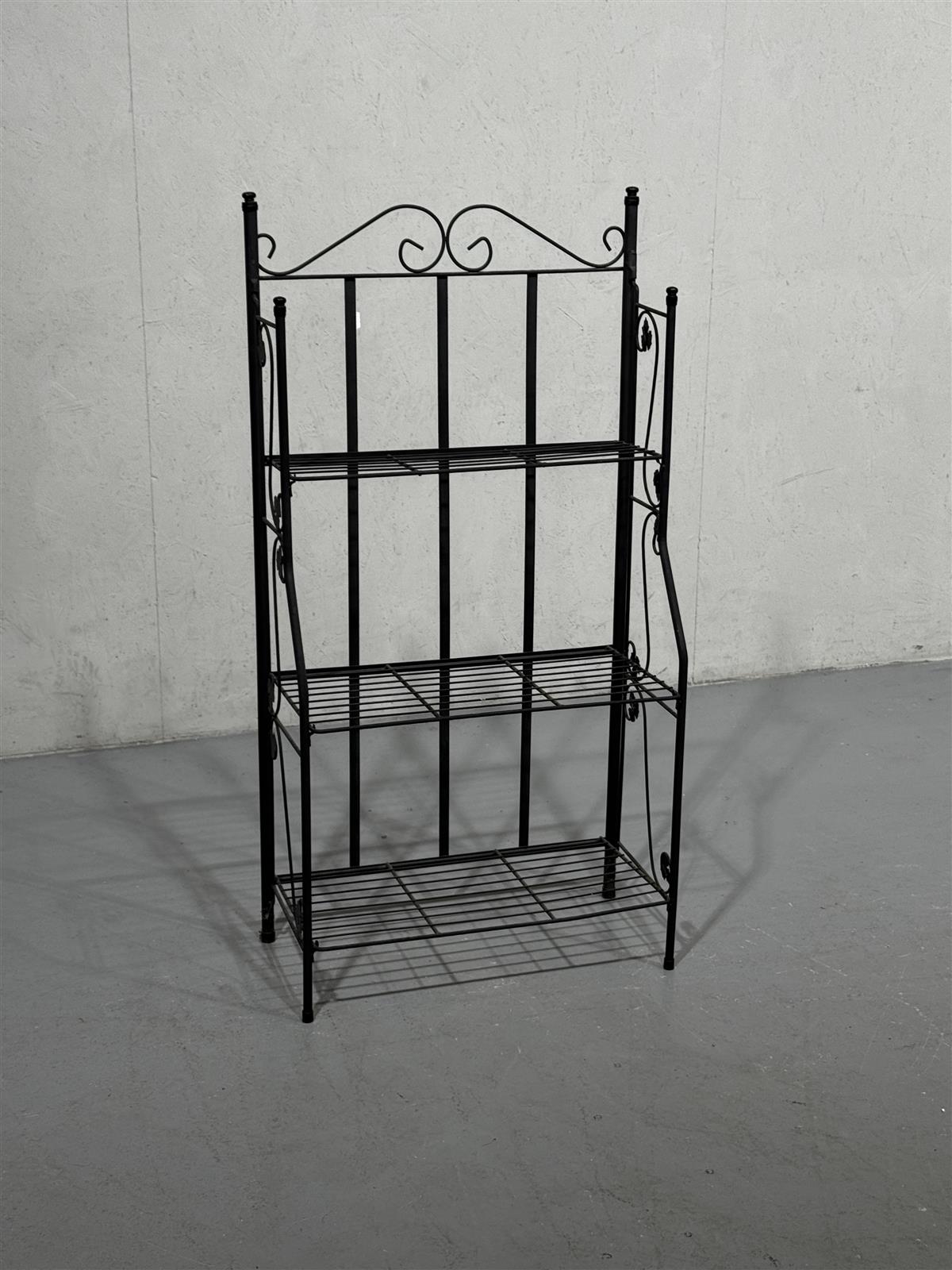Kolmitasoinen hyllykkö, jossa on koristeelliset yksityiskohdat yläosassa. Musta väri korostaa sen eleganttia ulkonäköä.