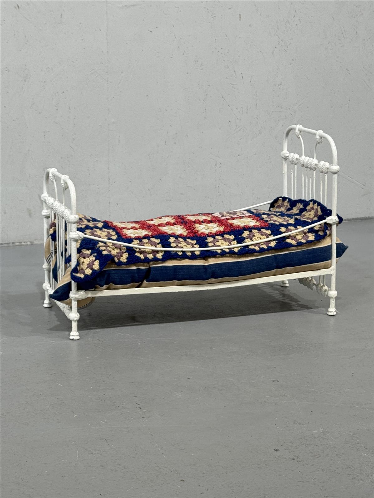 Viehättävä metallinen nukensänky, joka on maalattu valkoiseksi. Sängyssä on koristeellisia yksityiskohtia, jotka tuovat mieleen vanhan ajan käsityötaidon. Mukana tulee värikäs virkattu peitto, joka lisää sängyn nostalgista ilmettä. Tämä sänky sopii erinomaisesti lastenhuoneen sisustukseen tai keräilyesineeksi.