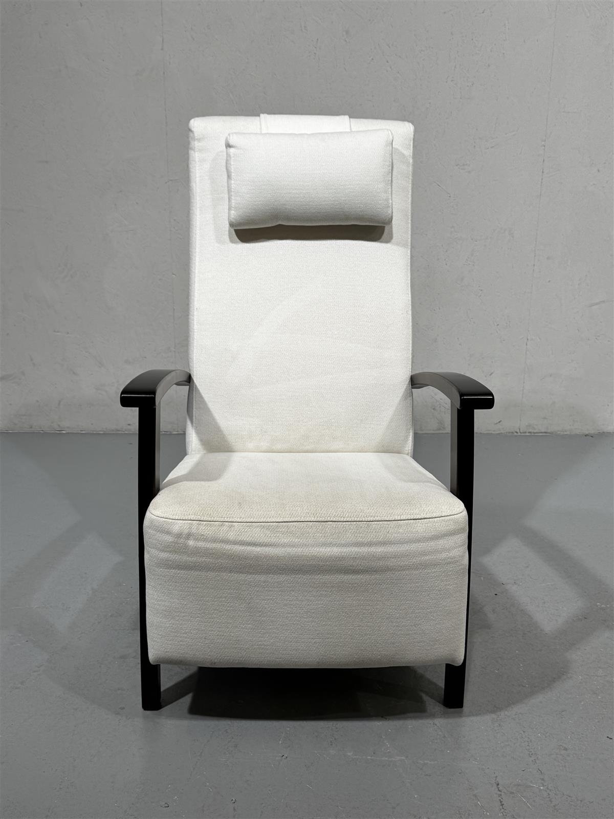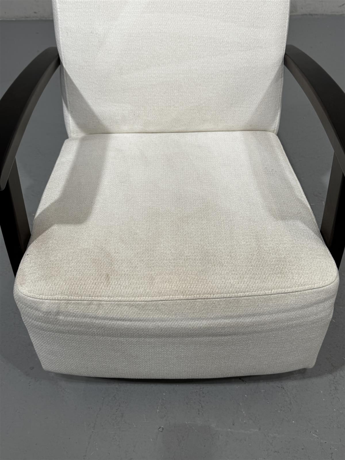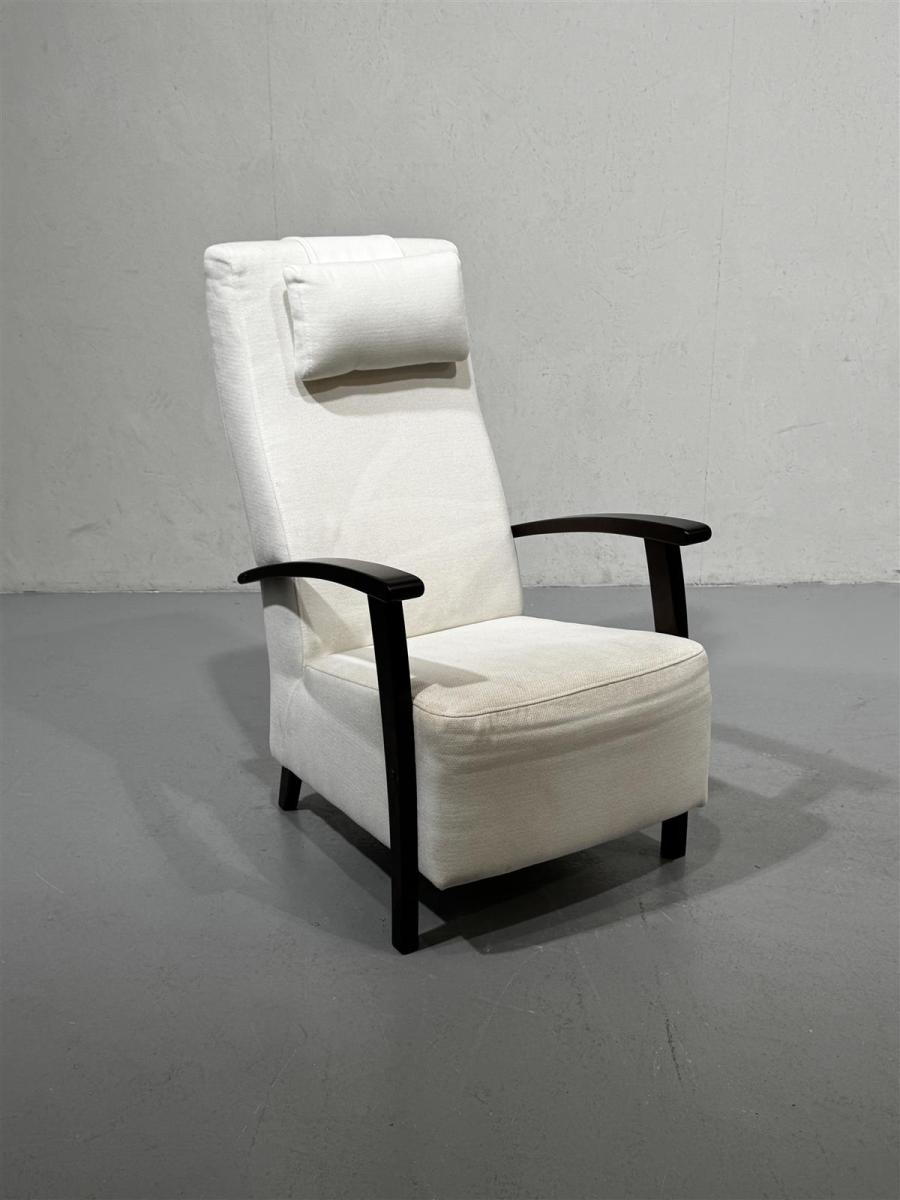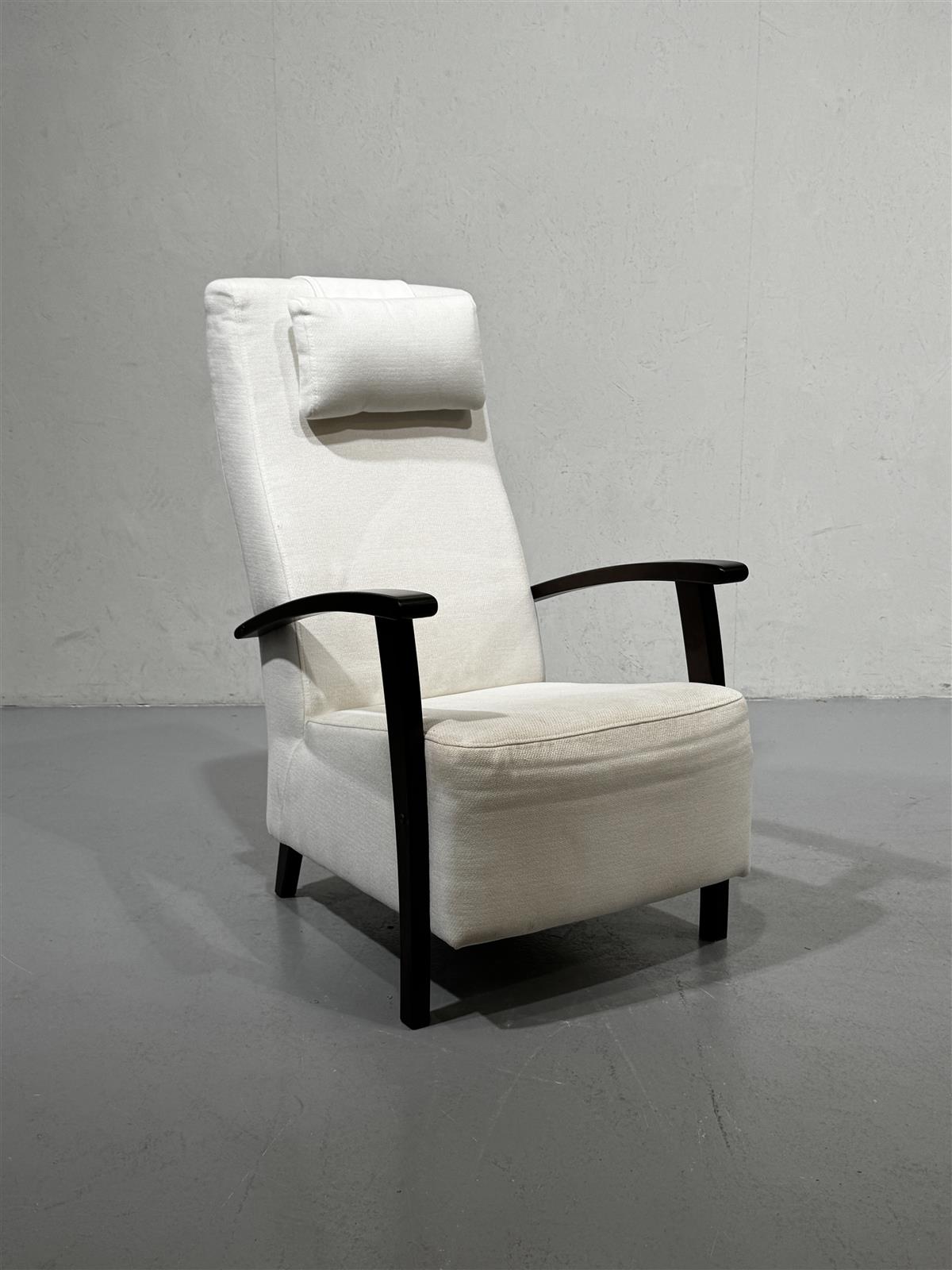 Tyylikäs Mila nojatuoli, jossa on valkoinen verhoilu ja tummat puukäsinojat. Selkänoja on korkea ja siinä on irrotettava niskatyyny, joka lisää mukavuutta.