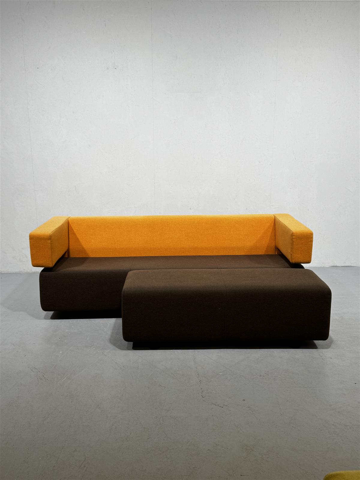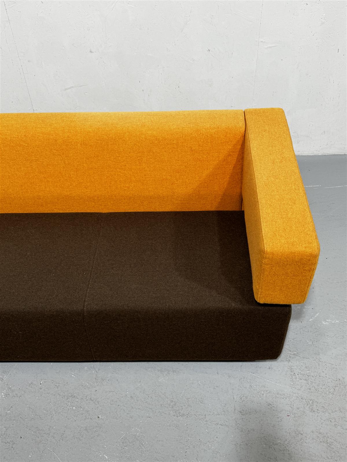 Kaksivärinen sohva, jossa on oranssi selkänoja ja käsinojat sekä ruskea istuinosa. Selkeälinjainen muotoilu ja matala profiili. Valmistajaa ei ole vahvistettu.