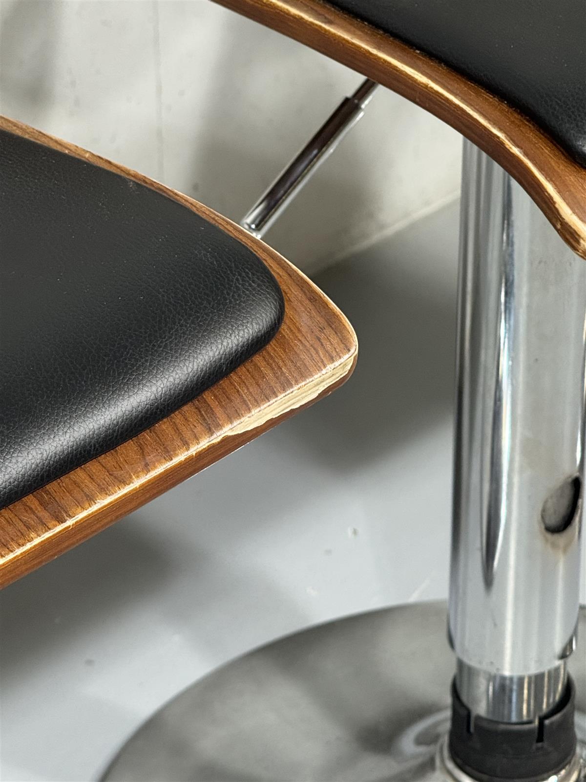 Neljä modernia baarituolia, joissa on ainutlaatuinen selkänojan muotoilu ja kromatut jalat. Istuimet ovat mustat ja pehmustetut mukavuuden lisäämiseksi.