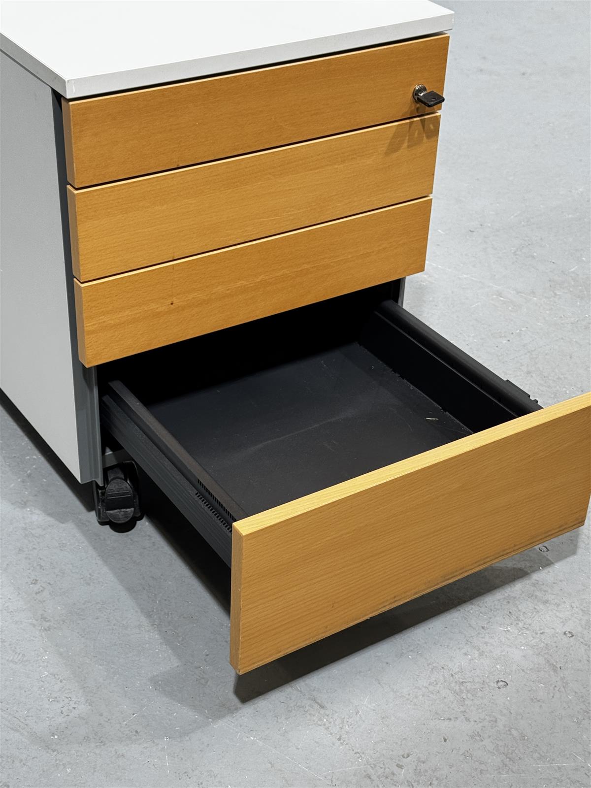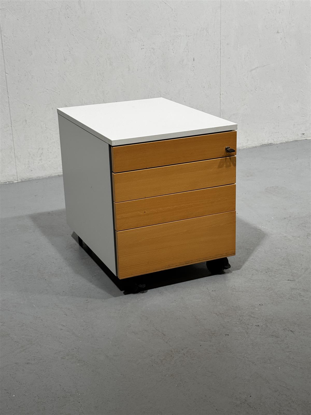 Laadukas laatikosto, jossa on neljä vetolaatikkoa ja pyörät helpottamaan liikuttelua. Yläosassa on lukko, joka tarjoaa lisäturvaa säilytykselle. Yksi vetolaatikko avautuu kerrallaan.