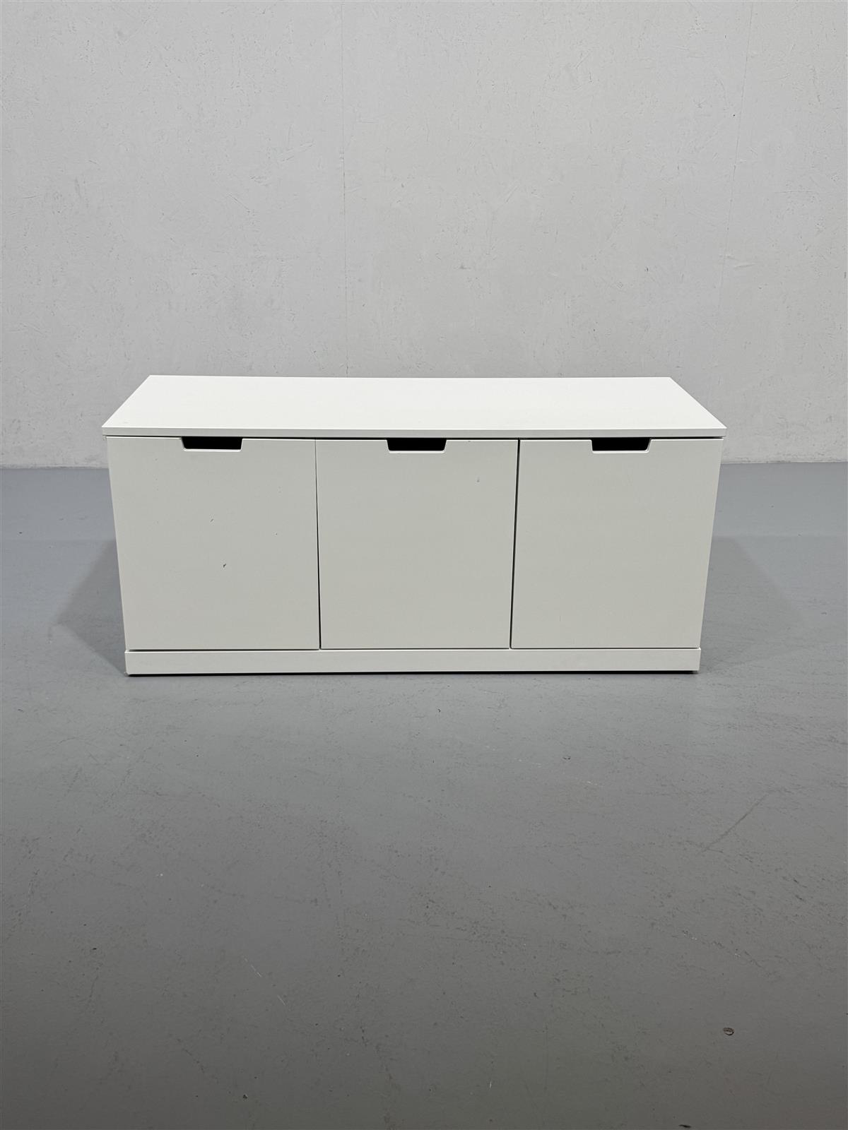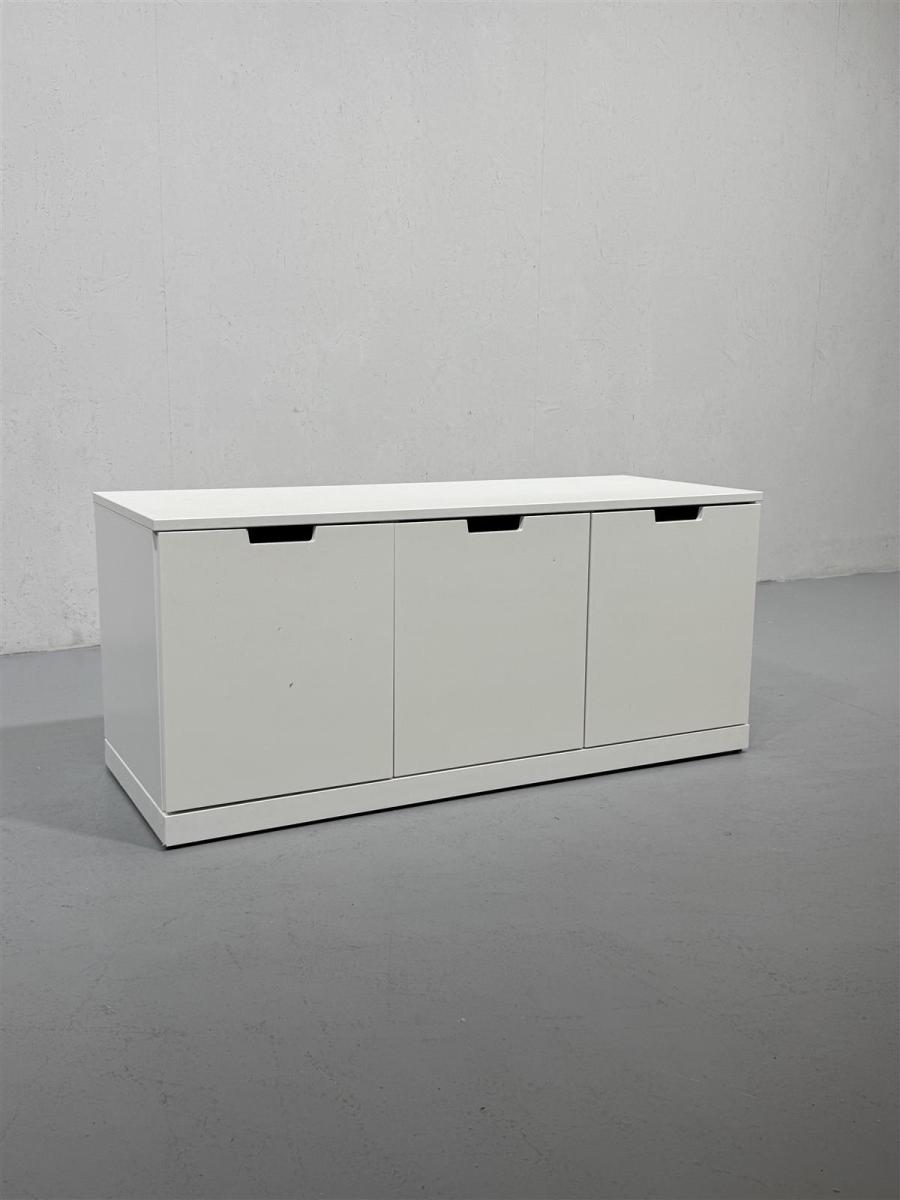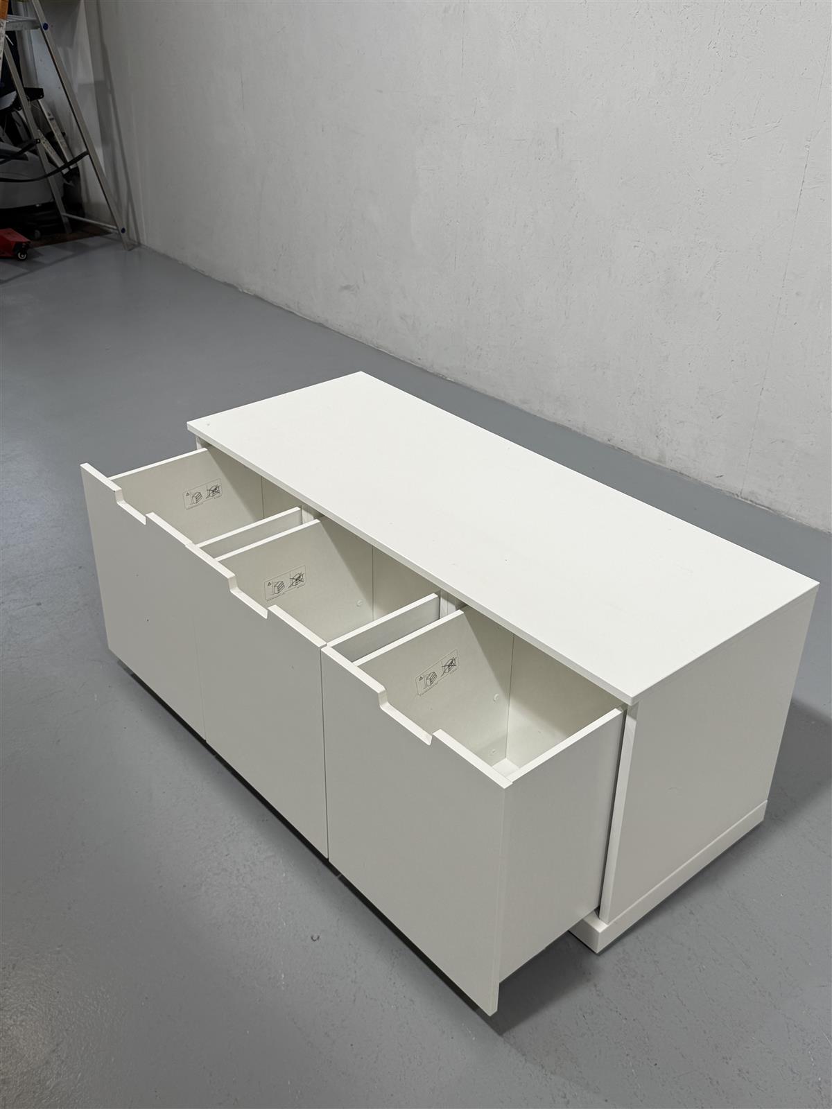 Valkoinen moderni säilytyskaappi, jossa on kolme vetolaatikkoa. Yksinkertainen ja toimiva muotoilu, joka sopii monenlaisiin tiloihin. Laatikot avautuvat helposti ja tarjoavat runsaasti säilytystilaa erilaisille tavaroille.