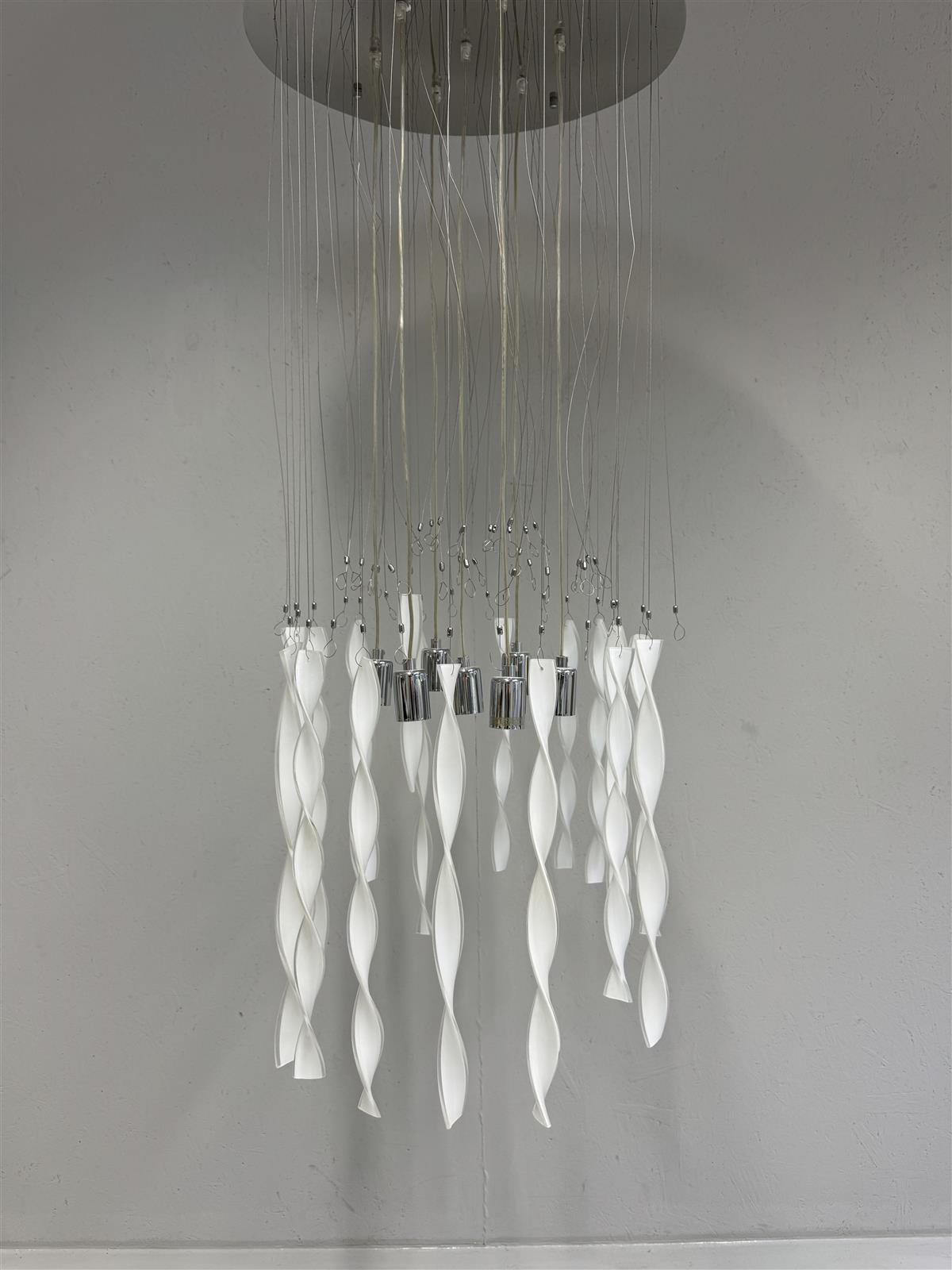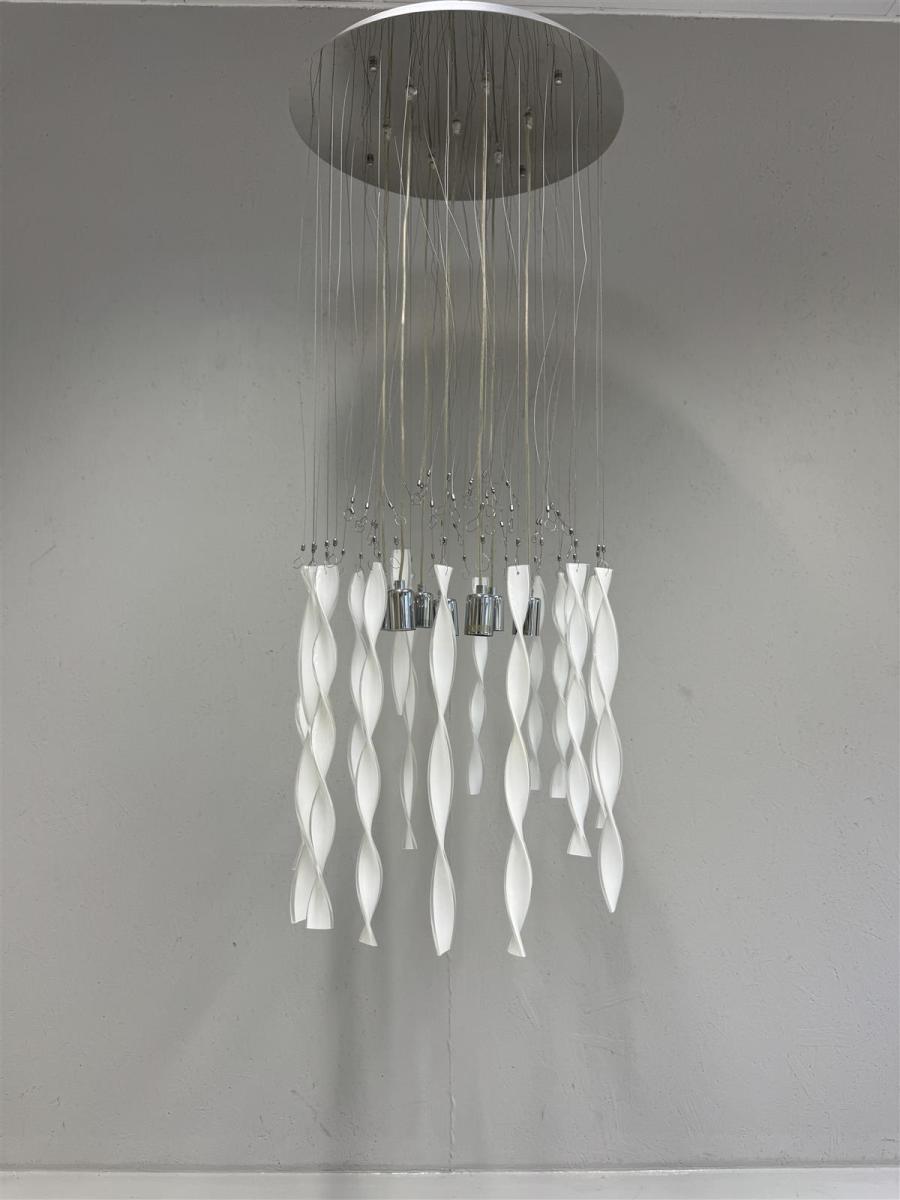 Moderni design kattovalaisin, jossa on useita valkoisia kierteisiä, eri pituisia lasielementtejä, jotka roikkuvat ohuista vaijereista. Valaisimen yläosa on metallinen ja keskellä roikkuvat valaisinpisteet. Lamput heijastavat valoa spiraalien kautta kauniisti. Lasispiraalit valkoisia keskeltä läpikuultavilla reunoilla. Tämä valaisin tuo tilaan näyttävyyttä ja modernia ilmettä. Korkeus katosta noin 140cm.