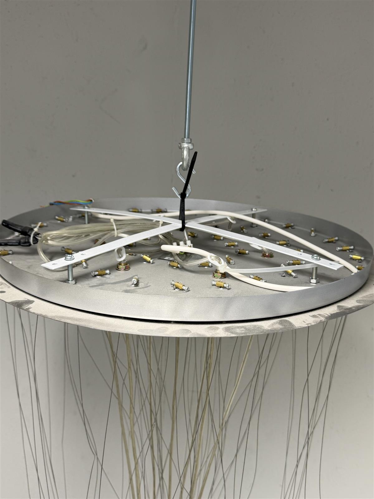 Kuvattu vain osan lasielementeistä kanssa. Elementtejä kiinnitetään valaisimeen useita kymmeniä eri mittaisia, jotka tulevat valaisimen mukana. Valaisimen lasispiraalit irroitettu valaisimesta. Suositellaan lasielementtien pesu alkuun, pinnalla piintynyttä pölyä. Yksi vaijerin kiinnitysnipukka poikki ja yksi lasielementti poikki. Toimiva valaisin. Kunto huomioitu hinnassa.