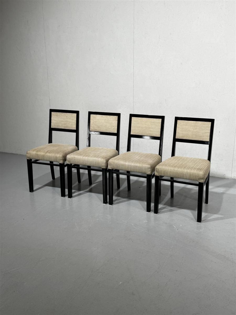 Neljä modernia tuolia, joissa on musta puurunko ja vaaleanruskea verhoilu. Tuolit ovat yksinkertaisen tyylikkäitä ja sopivat monenlaisiin sisustuksiin.