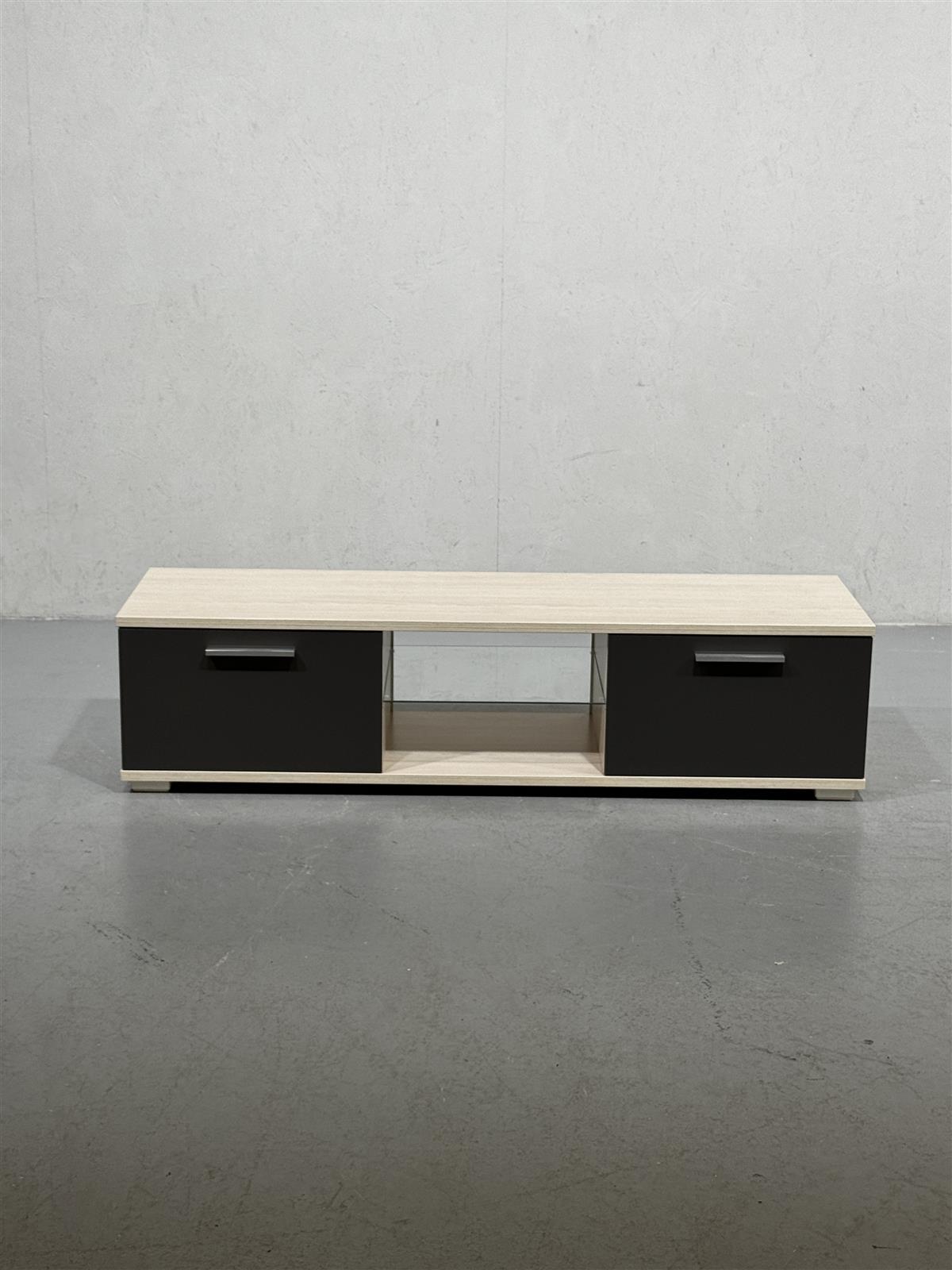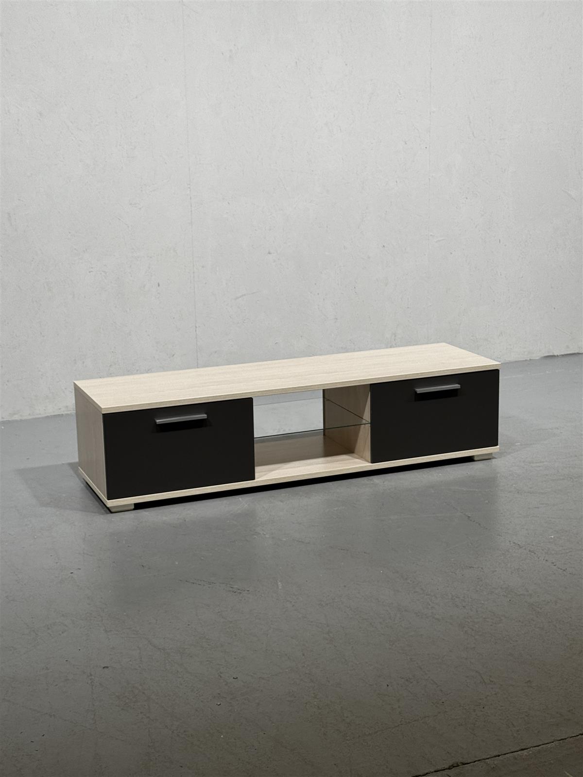Moderni TV-taso, jossa on kaksi mustaa vetolaatikkoa ja keskellä avoin tila lasihyllyllä. Taso on selkeälinjainen ja käytännöllinen. Sopii hyvin monenlaiseen sisustukseen.