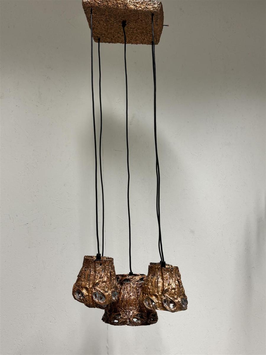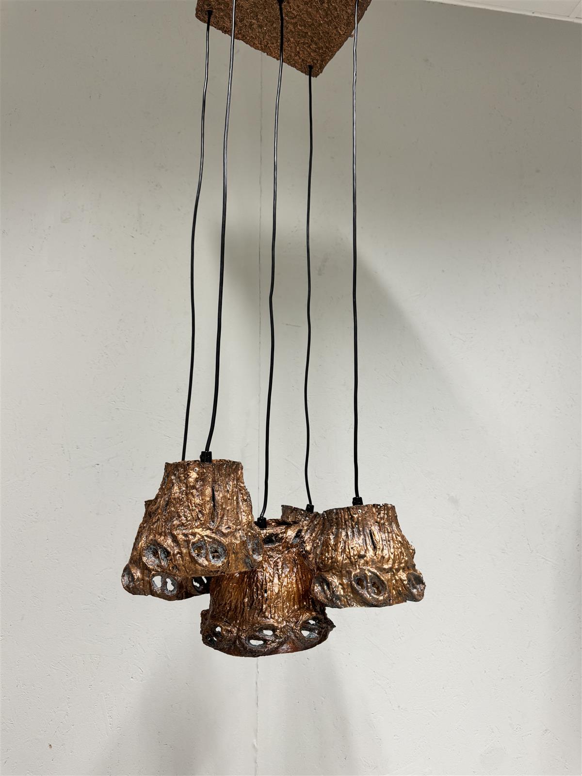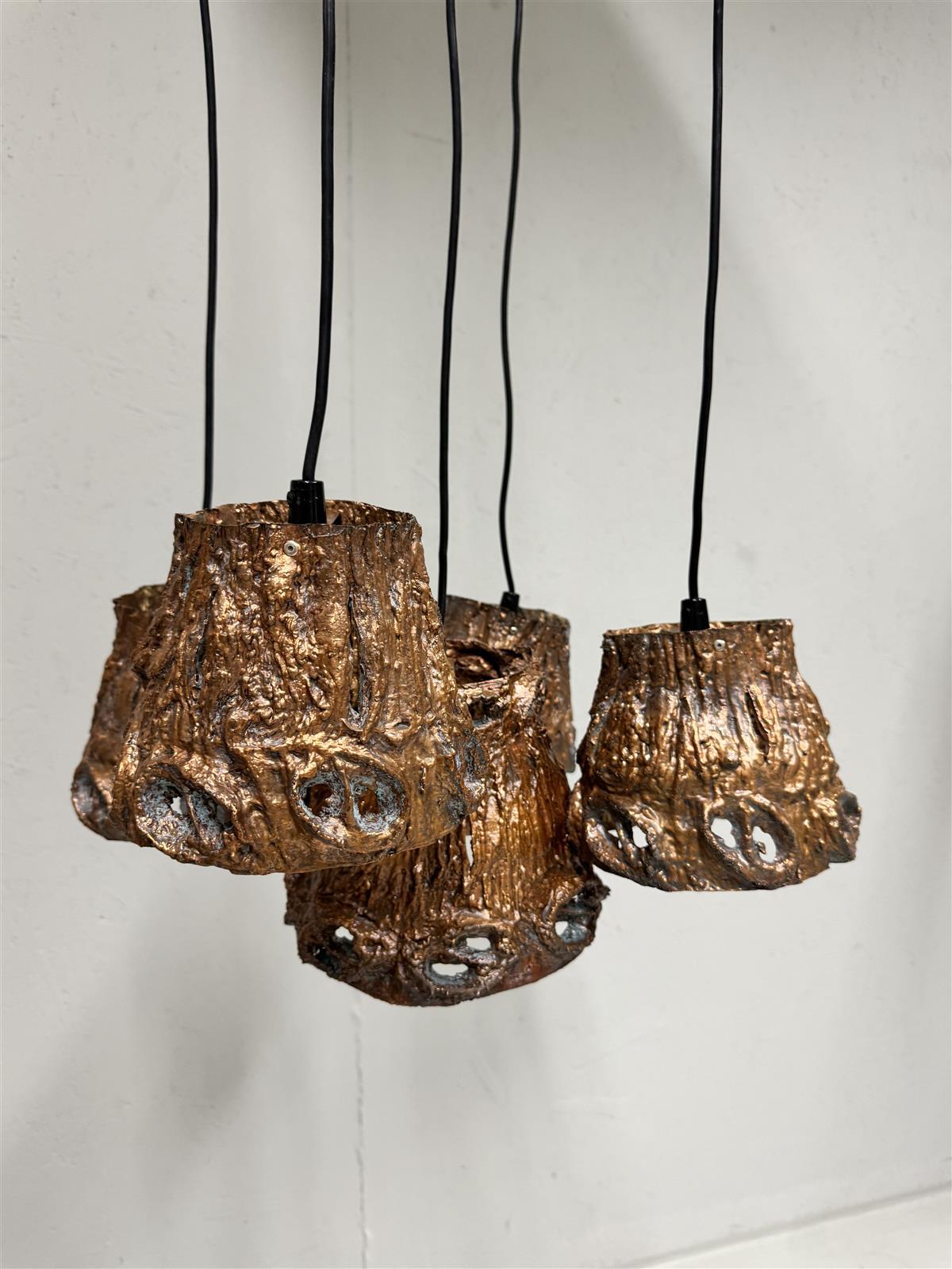 Moonlight Oy:n valmistama erikoinen kattovalaisin, jossa on viisi erillistä, riippuvaa kuparivarjostinta. Valaisimessa on karkea, teksturoitu pinta, joka tuo mieleen käsityönä tehdyn ilmeen. Design Aimo Tukiainen. Valaisimen johdot ovat mustat ja ne roikkuvat vapaasti katosta, mikä antaa valaisimelle modernin ja teollisen ilmeen.