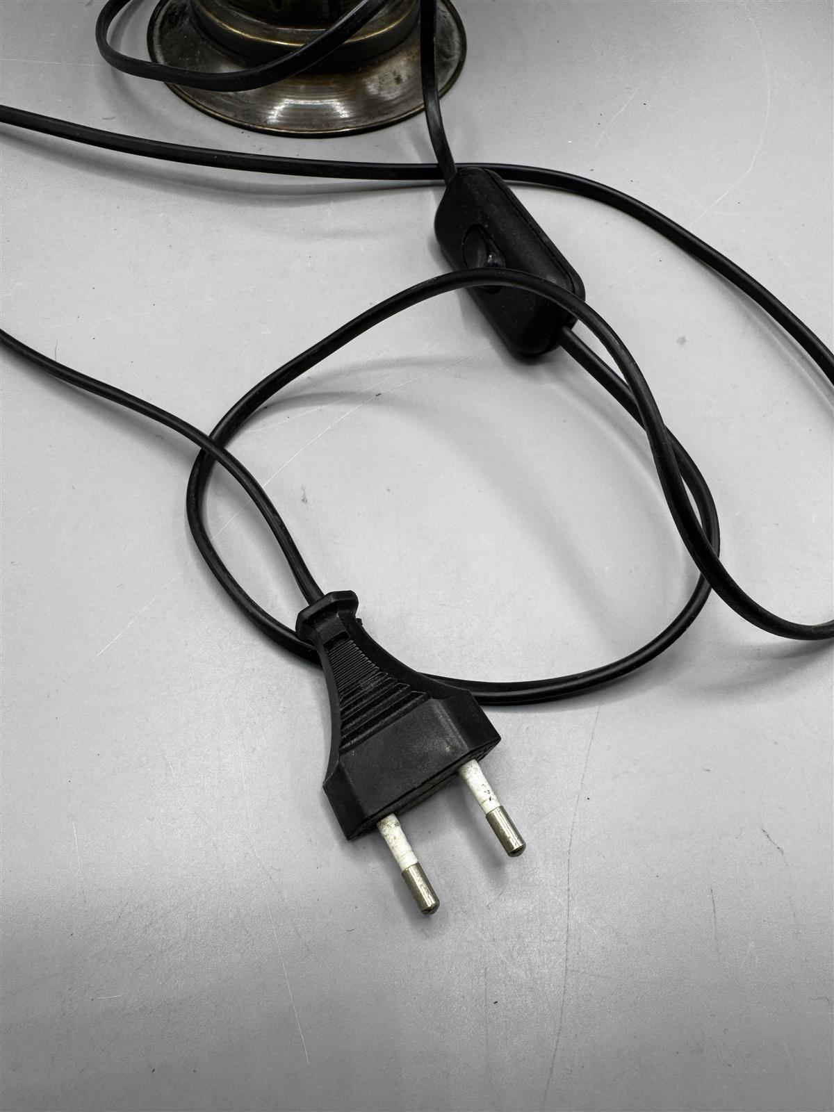 Valaisimessa ei ole näkyviä vaurioita ja se on toimiva. Hieman kenossa jalustassaan.