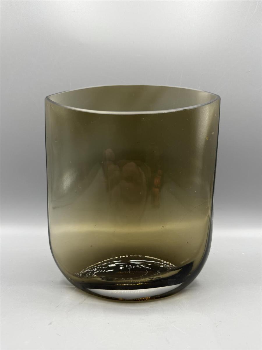 Ruskea Muurlan lasimaljakko, jossa on moderni muotoilu. Maljakko on valmistettu tummasta lasista ja siinä on pyöristetyt reunat.