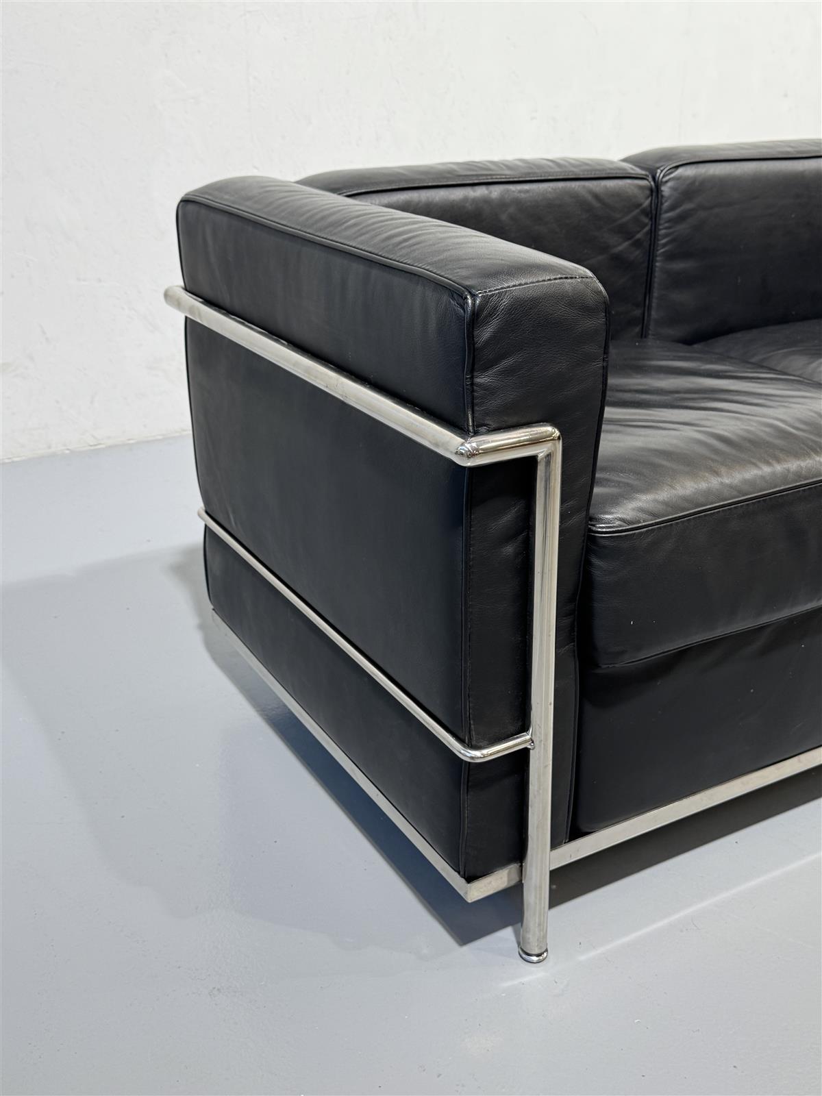 Tyylikäs replica nahkasohva kolmelle. Sen teräsrunko ja musta nahkaverhoilu luovat ajattoman ilmeen, joka sopii monenlaisiin sisustuksiin. Tämä sohva replica Le Corbusierin”LC-2″ klassikosta.