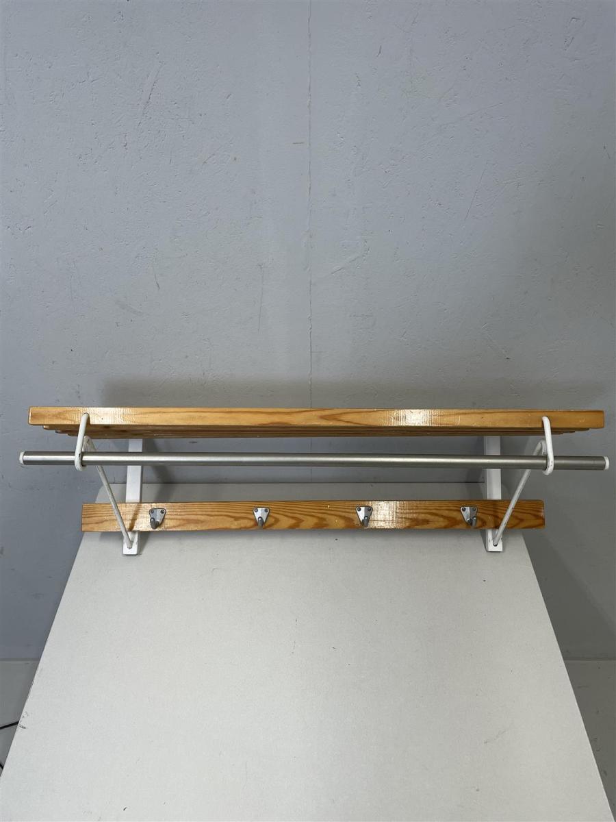 Naulakko, jossa on puinen hattuhylly ja metallinen tanko. Siinä on neljä koukkua ripustamista varten. Yksinkertainen ja käytännöllinen muotoilu, joka sopii monenlaisiin tiloihin.