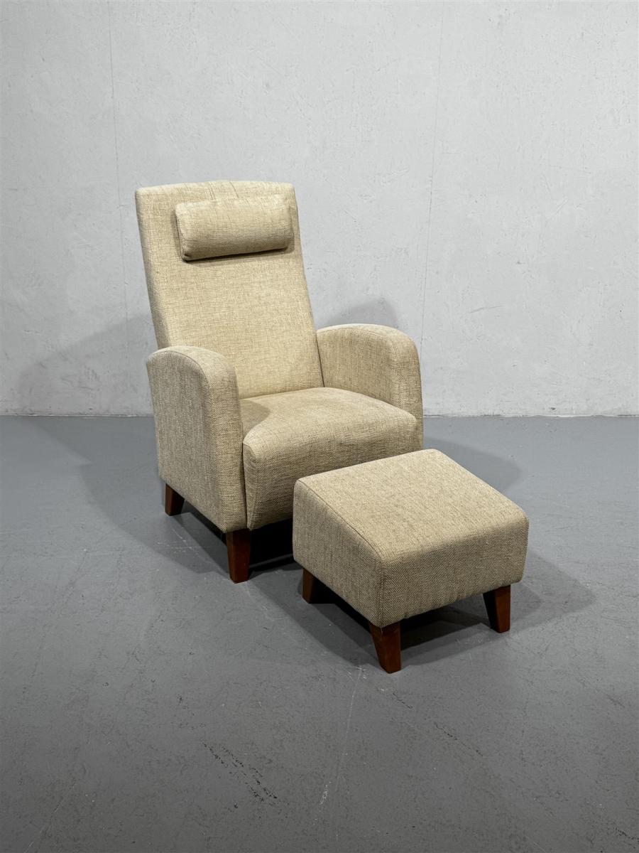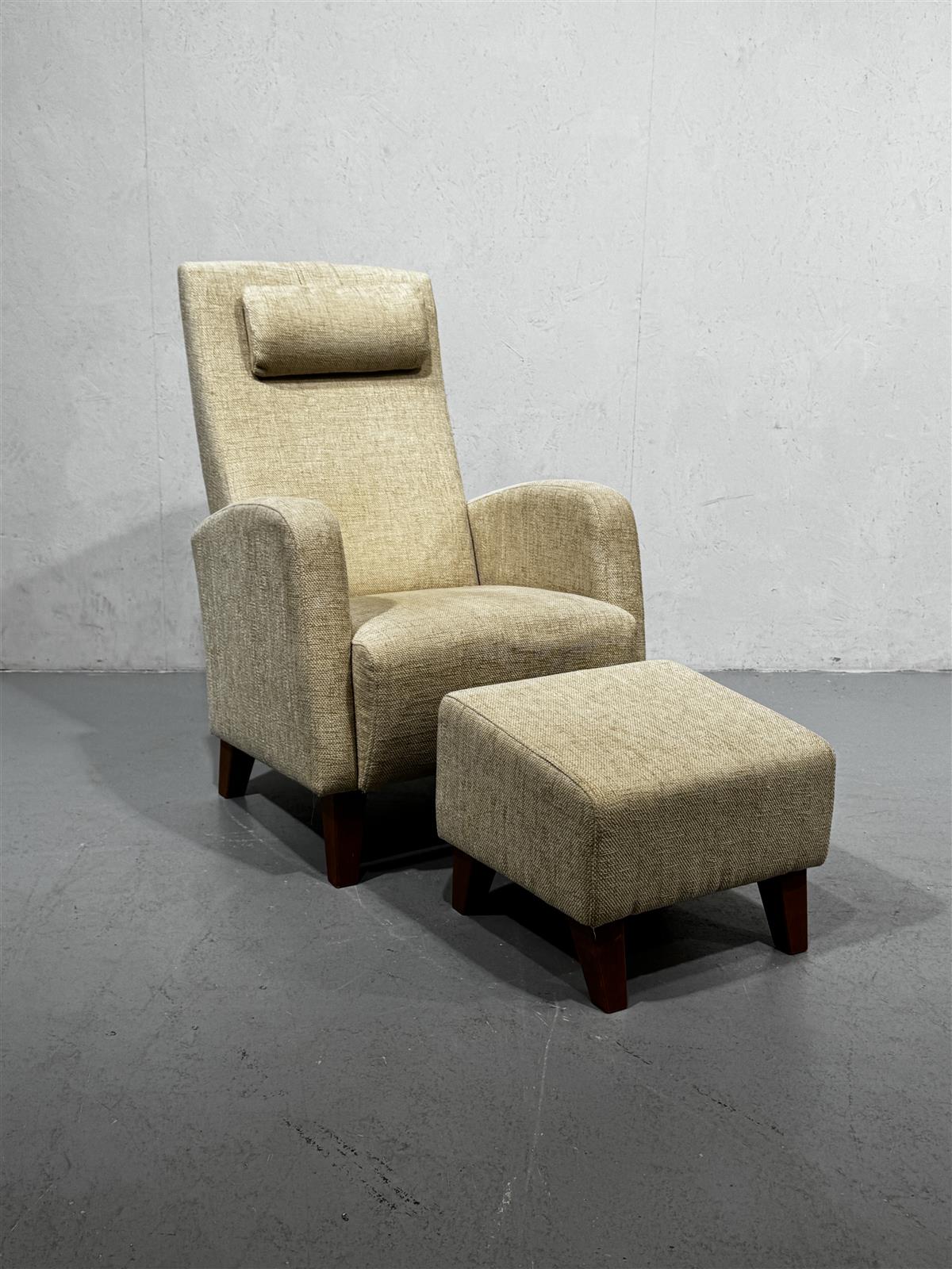Tyylikäs moderni nojatuoli ja rahi, jotka on verhoiltu beigen sävyisellä kankaalla. Tuolin selkänoja on korkea ja siinä on mukava niskatuki, joka lisää istumismukavuutta. Rahi täydentää kokonaisuuden ja tarjoaa lisämukavuutta jaloille.
