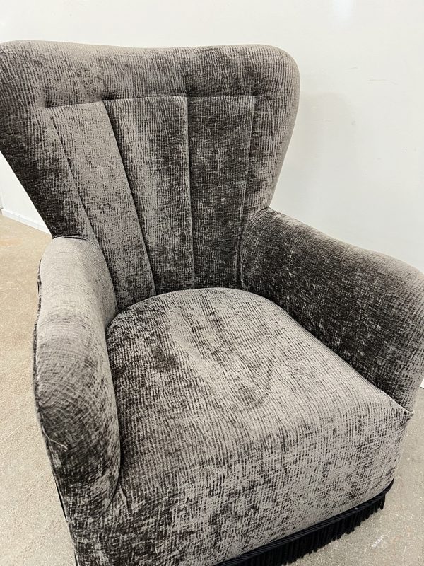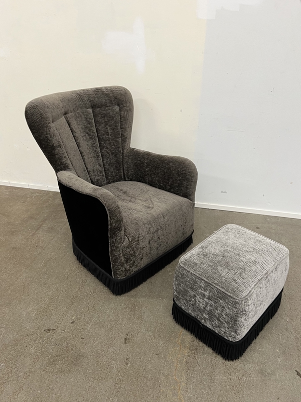 Muhkea kangasverhoiltu nojatuoli rahilla. Nojatuolissa tummanharmaa kangasverhoilu istuinosassa ja musta takaosa. Rahin ja istuimen alaosassa koristehapsut.