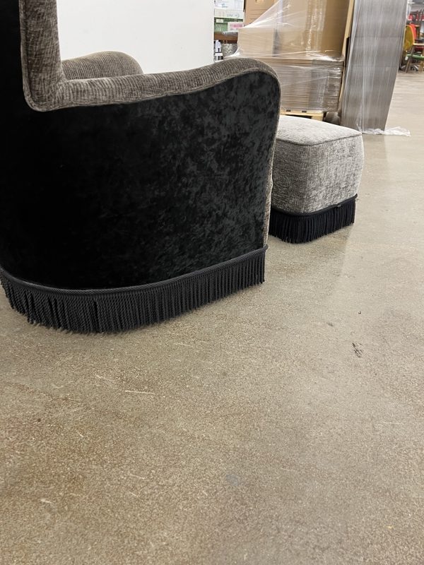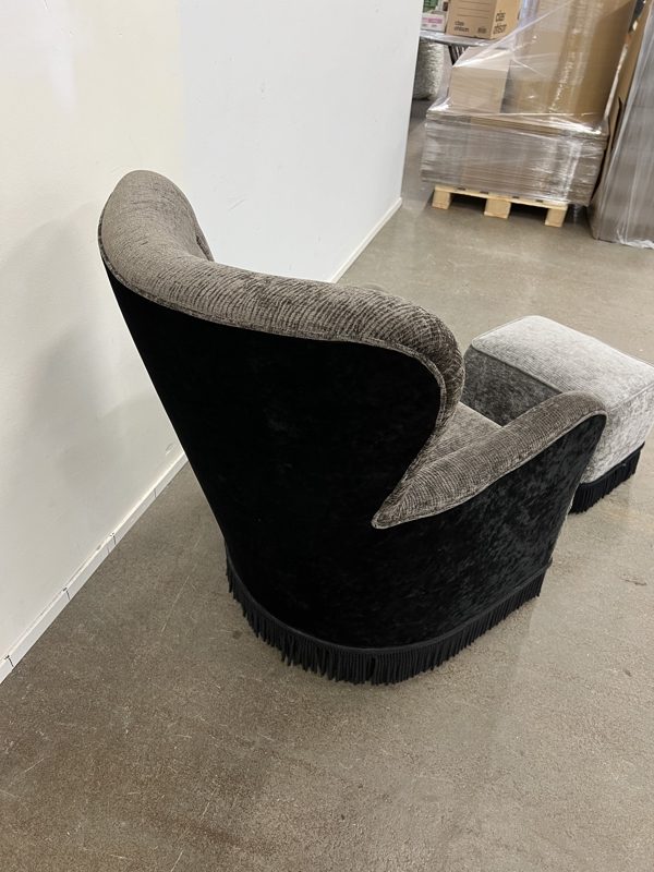 Muhkea kangasverhoiltu nojatuoli rahilla. Nojatuolissa tummanharmaa kangasverhoilu istuinosassa ja musta takaosa. Rahin ja istuimen alaosassa koristehapsut.