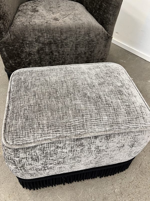 Muhkea kangasverhoiltu nojatuoli rahilla. Nojatuolissa tummanharmaa kangasverhoilu istuinosassa ja musta takaosa. Rahin ja istuimen alaosassa koristehapsut.