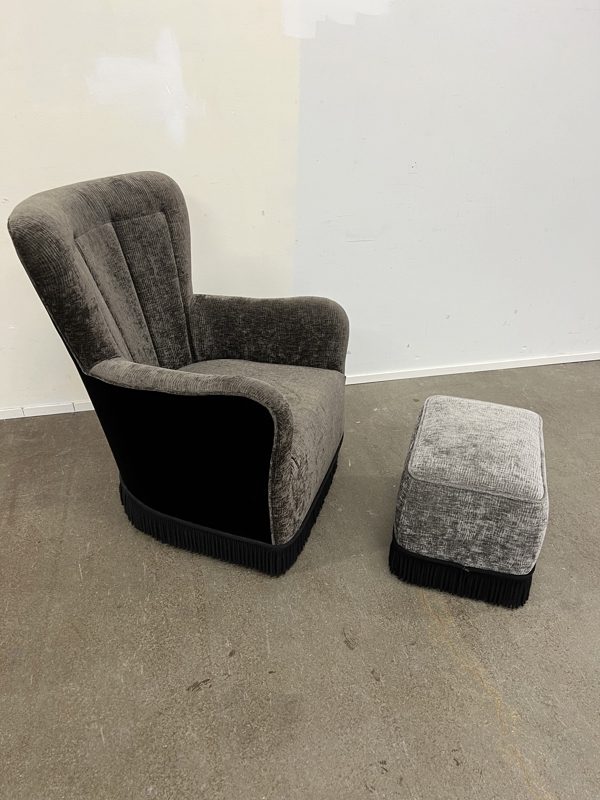 Muhkea kangasverhoiltu nojatuoli rahilla. Nojatuolissa tummanharmaa kangasverhoilu istuinosassa ja musta takaosa. Rahin ja istuimen alaosassa koristehapsut.