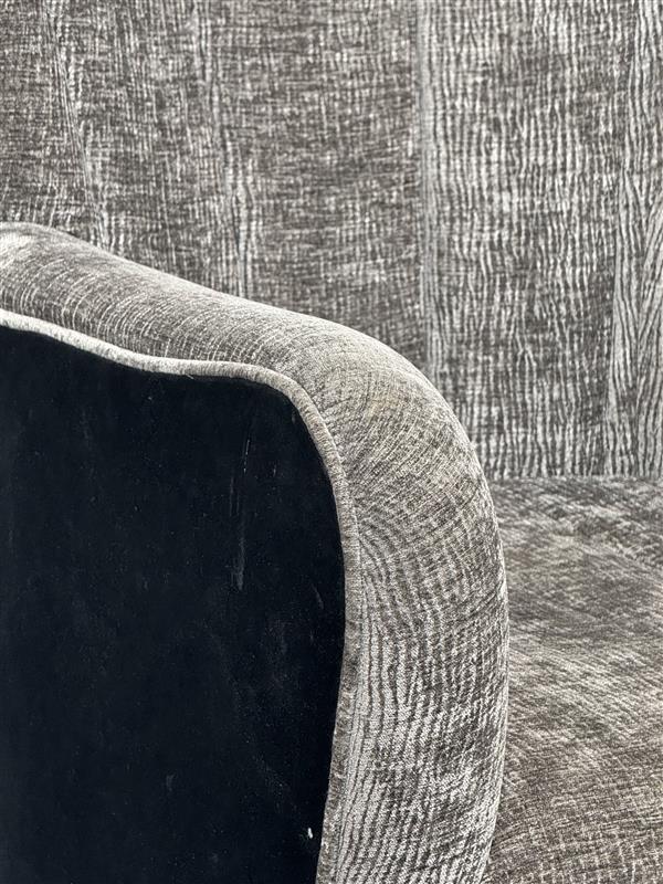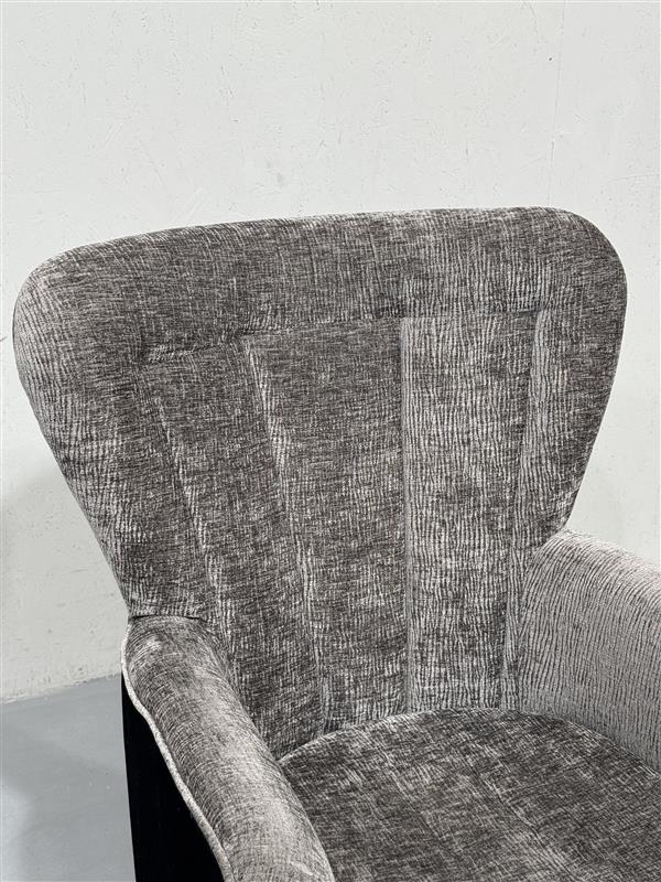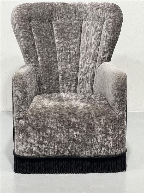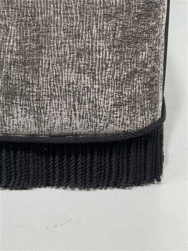 Tyylikäs harmaa nojatuoli mustalla hapsulla alareunassa. Mukana tukeva jalkatuki / rahi.