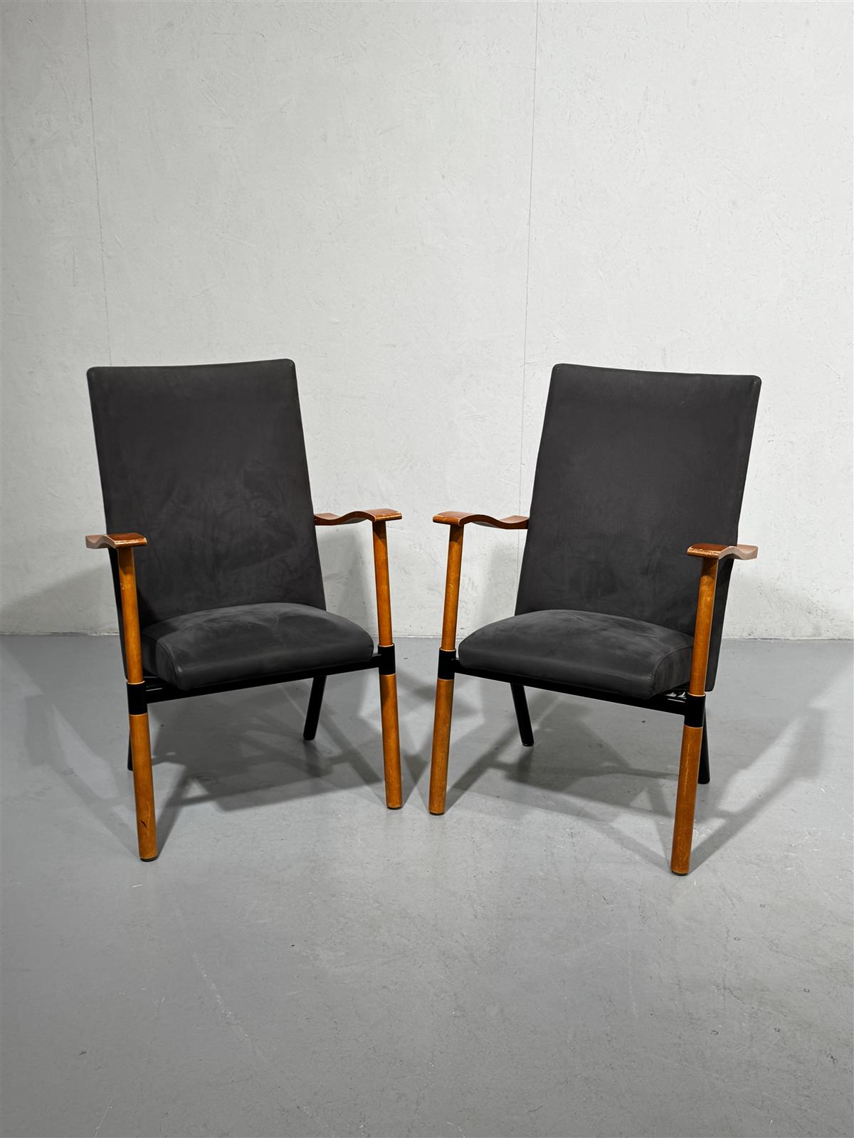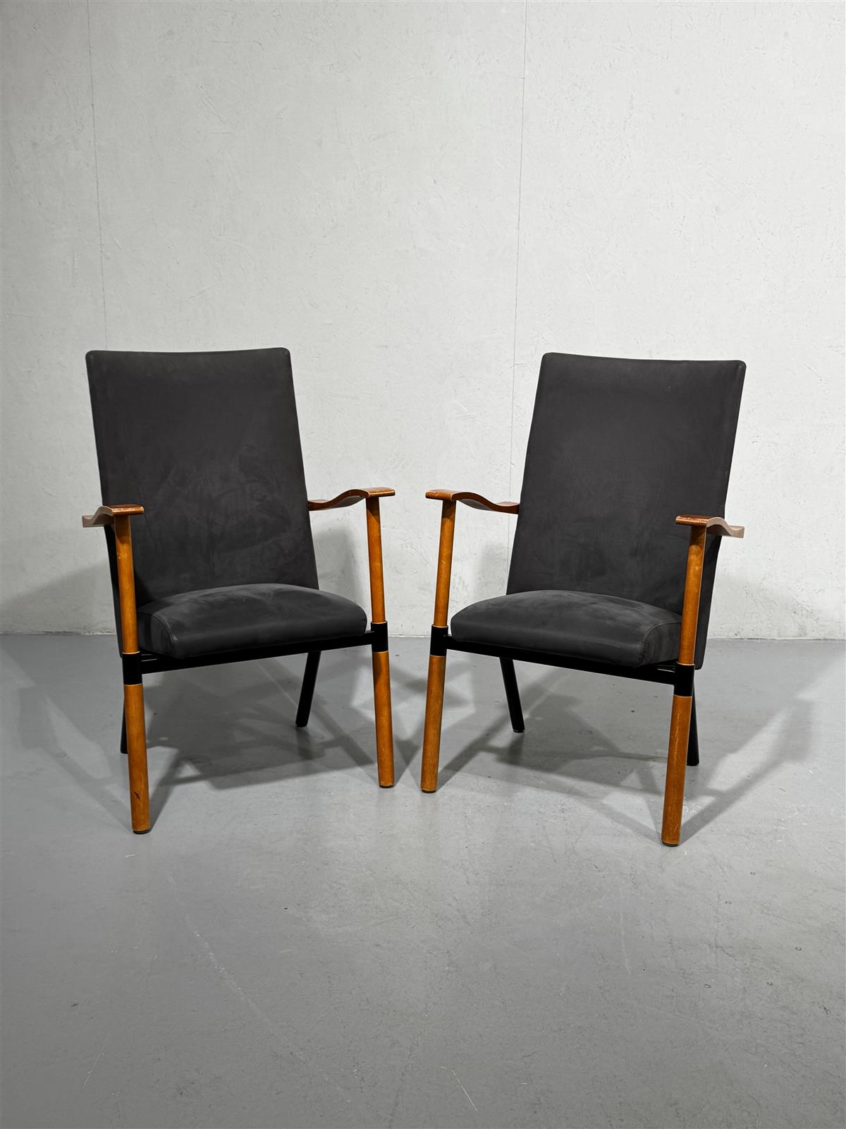 Kaksi modernityylistä tuolia, joissa on harmaat kangas istuimet ja selkänojat. Tuolien käsinojat ja jalat ovat puunväriset.