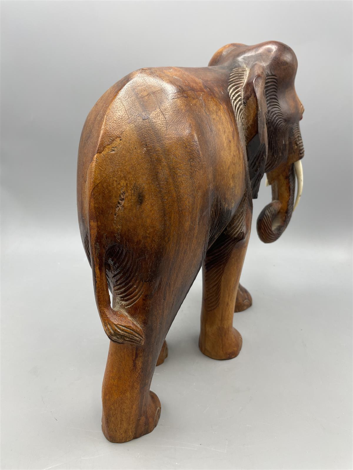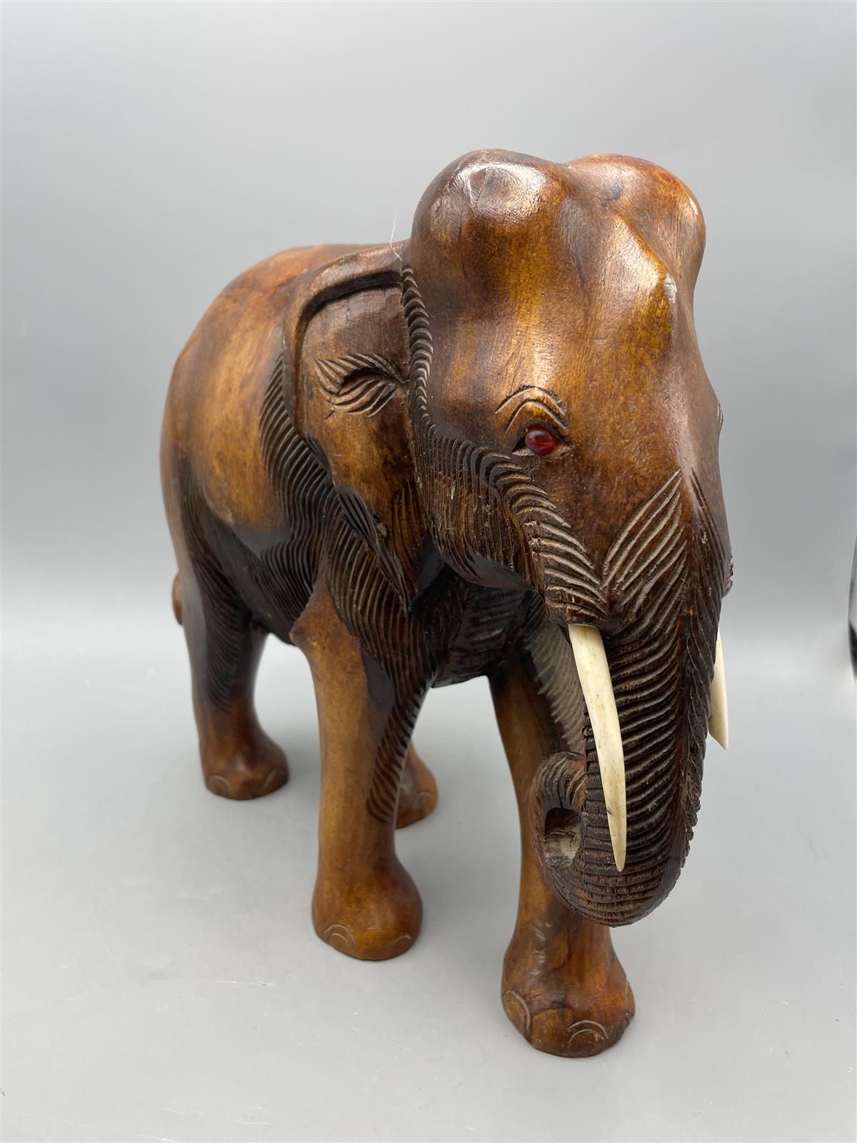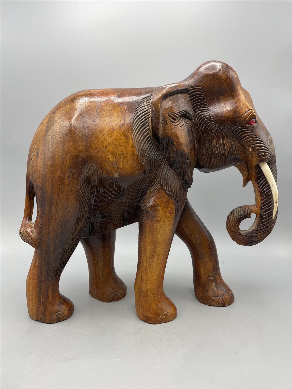 Käsinveistetty puinen norsu, jossa on yksityiskohtaiset kaiverrukset ja valkoiset syöksyhampaat. Norsun silmät ovat punaiset, mikä antaa sille elävän ilmeen. Veistos on valmistettu tummasta puusta, joka korostaa sen luonnollista kauneutta.