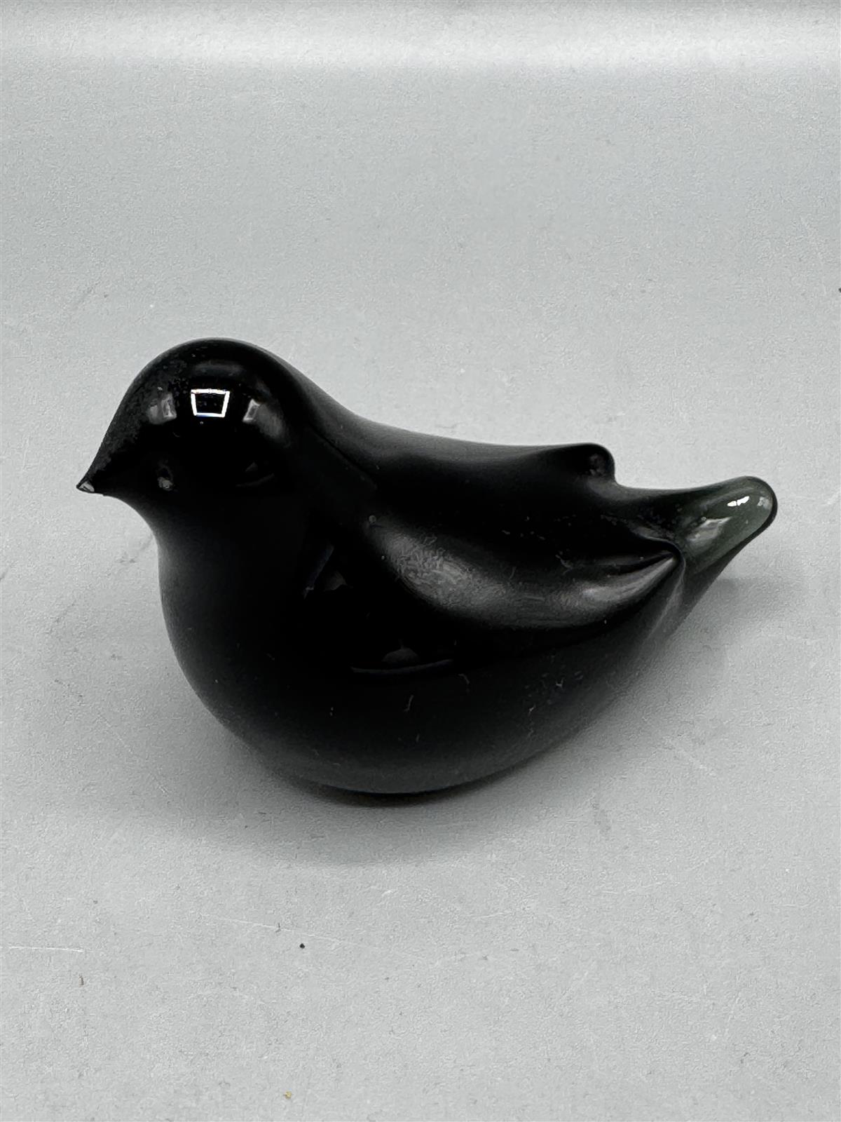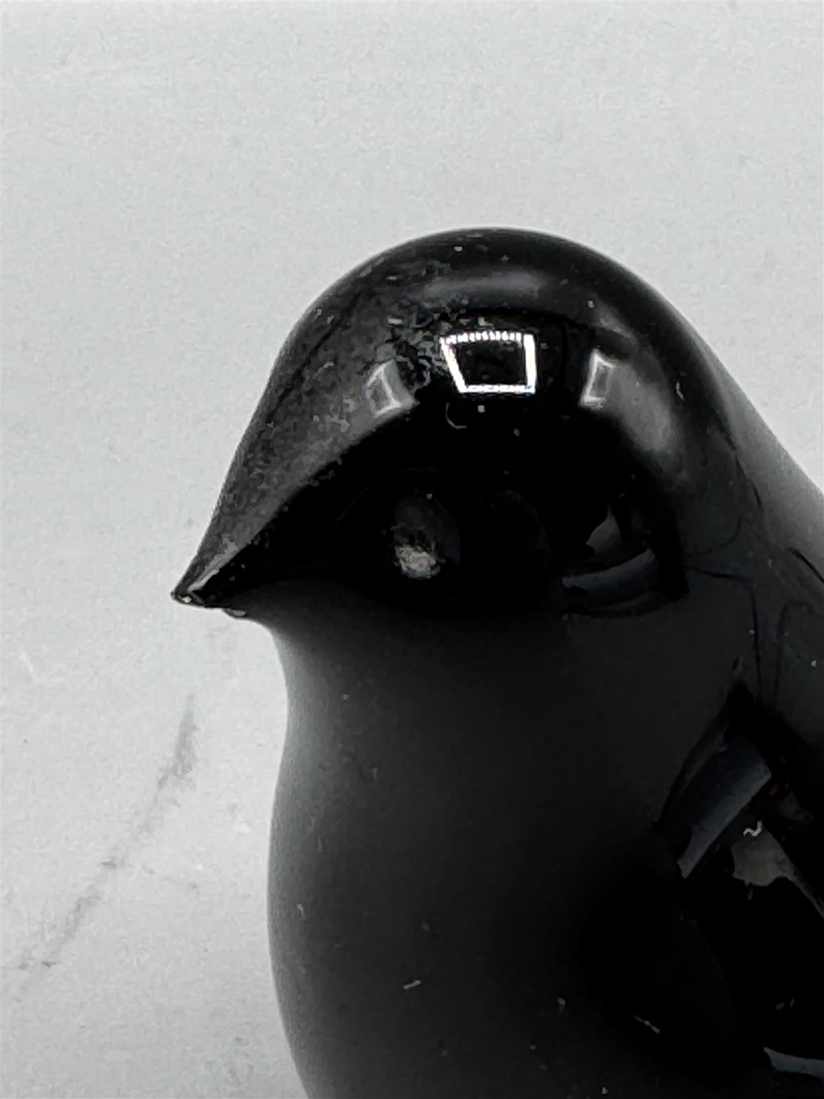 Pieni musta Nuutajärven lasin vuoden 1965 lasilintu, jossa on kiiltävä pinta. Lintu on muotoiltu yksinkertaisesti ja tyylikkäästi.