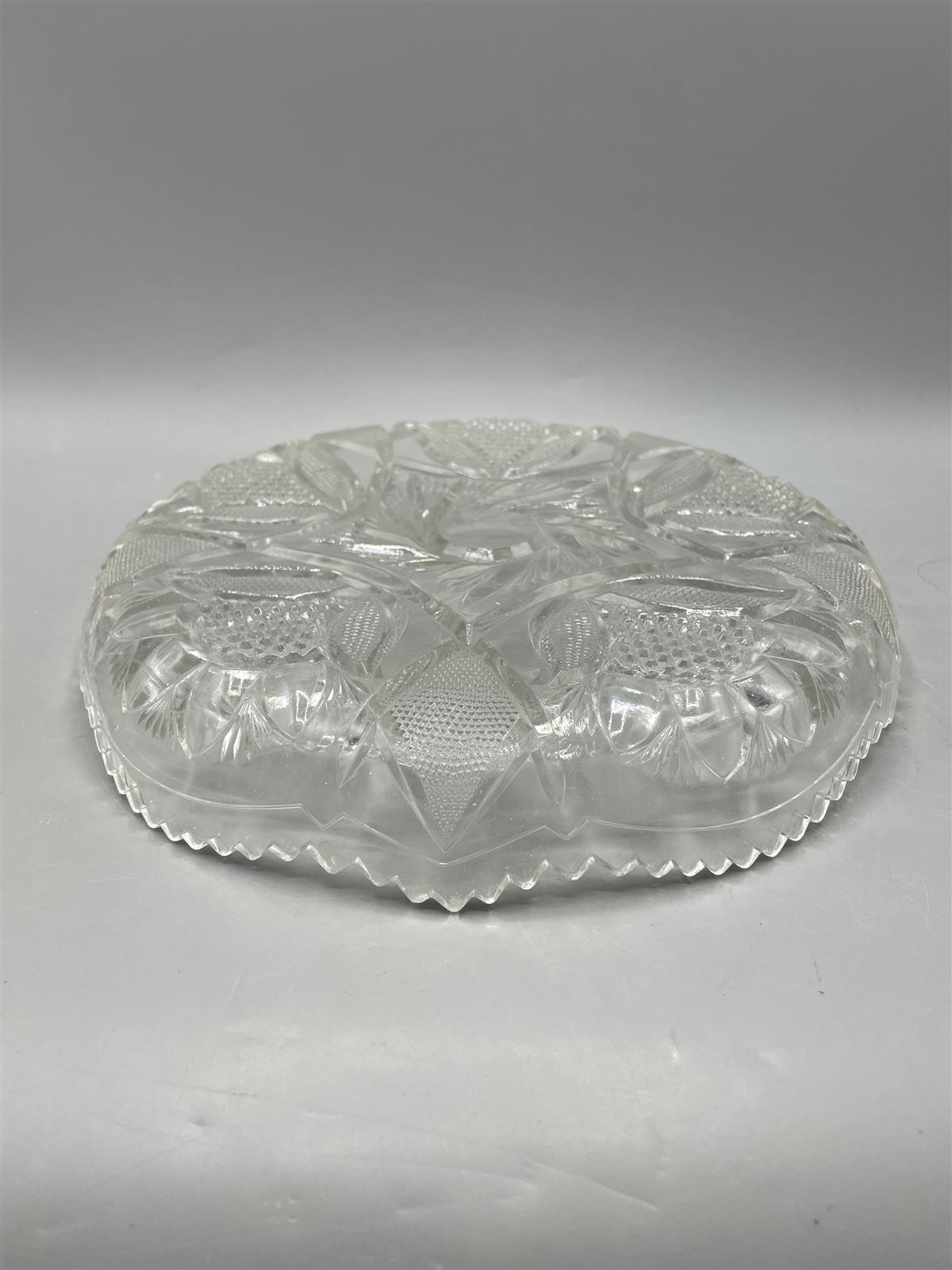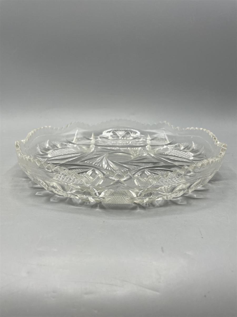 Pyöreä kristallinen tarjoilulautanen, jossa on koristeellinen kaiverrus. Lautasen reunat ovat aaltomaiset ja siinä on monimutkainen kuviointi. Halkaisija 26cm.