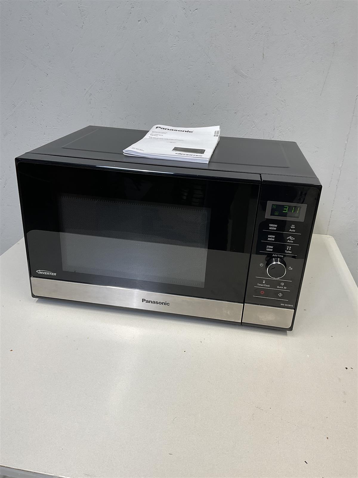 Panasonicin mikroaaltouuni, malli NN-SD28HS, tarjoaa tehokkaan ja monipuolisen ruoanlaittokokemuksen. Inverter-teknologia takaa tasaisen lämmityksen ja sulatuksen.