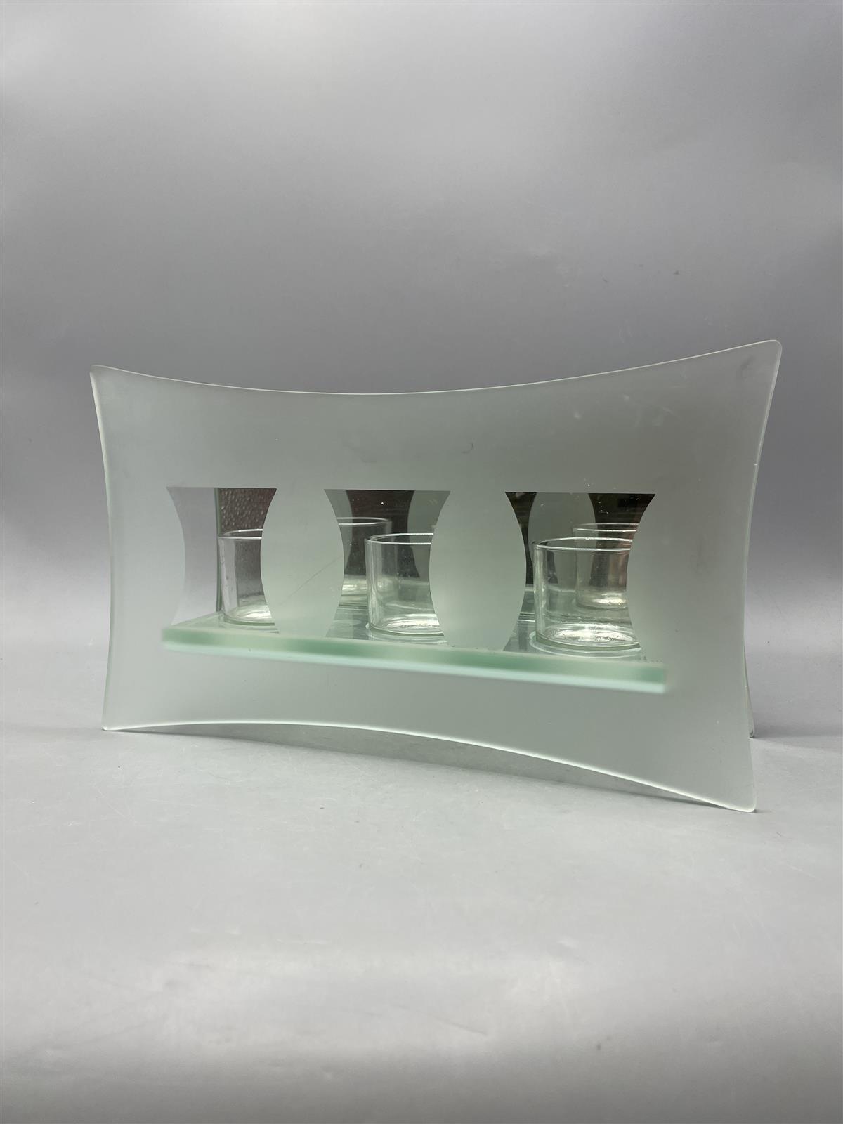 PartyLite kynttilänjalka, jossa on kolme lasista kynttiläkuppia. Kynttilänjalka on valmistettu lasista ja siinä on tyylikäs, kaareva muotoilu.
