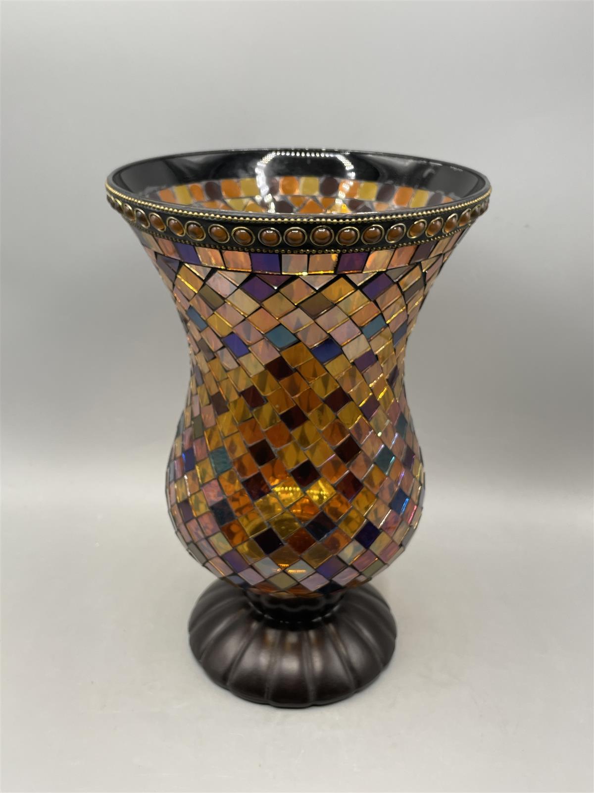 Partylite Mosaiikkimaljakko, jossa on monivärinen lasimosaiikki ja koristeellinen jalusta. Korkeus 30cm.