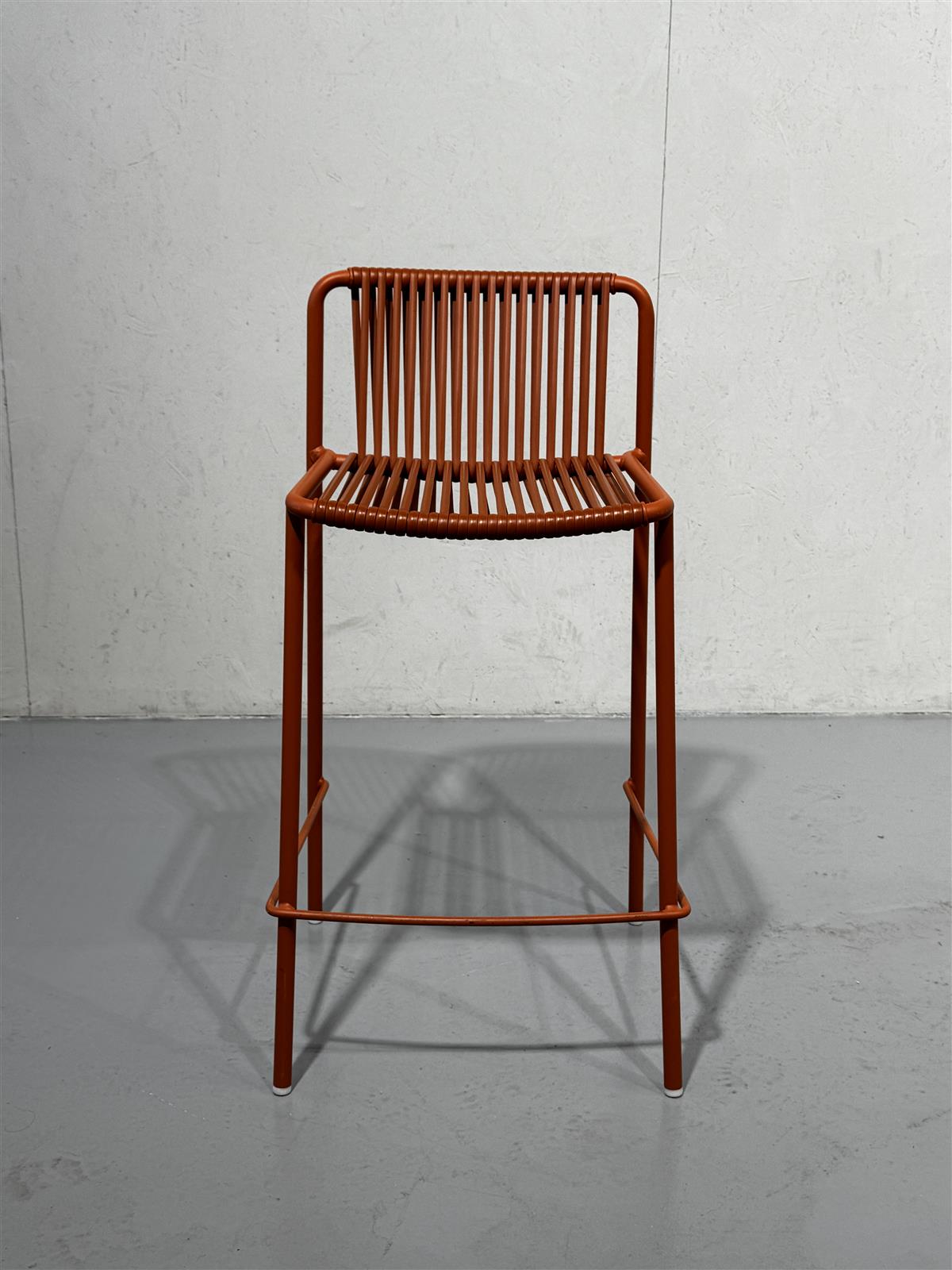 Moderni Pedrali Tribeca oranssi baarituoli, jossa on selkeä ja minimalistinen muotoilu. Tuoli on korkea ja siinä istuinosa, joka koostuu polyrottinki nyöreistä. Istuinkorkeus 72cm. Erinomainen kunto ja pinottavissa.