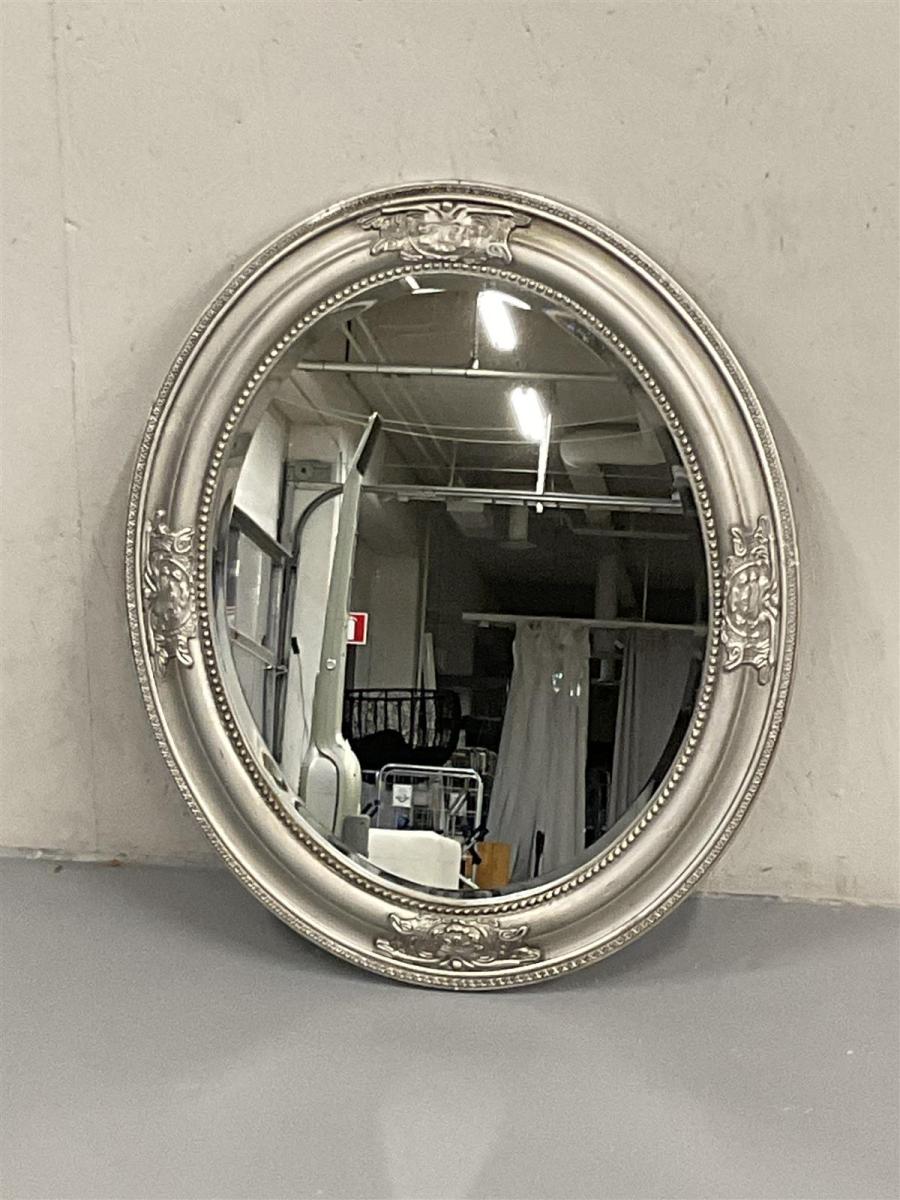 Tyylikäs ovaali peili, jossa on koristeellinen puukehys. Kehyksen hopeinen sävy tuo esiin peilin klassisen ilmeen.