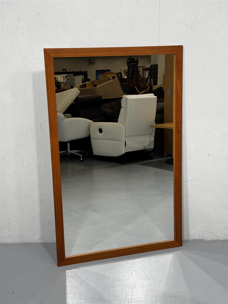 Suorakulmainen peili, jossa on laadukas paksu puukehys. Kehyksen leveys on noin 90 cm ja korkeus noin 140 cm. Takana kaksi kiinnityspistettä.