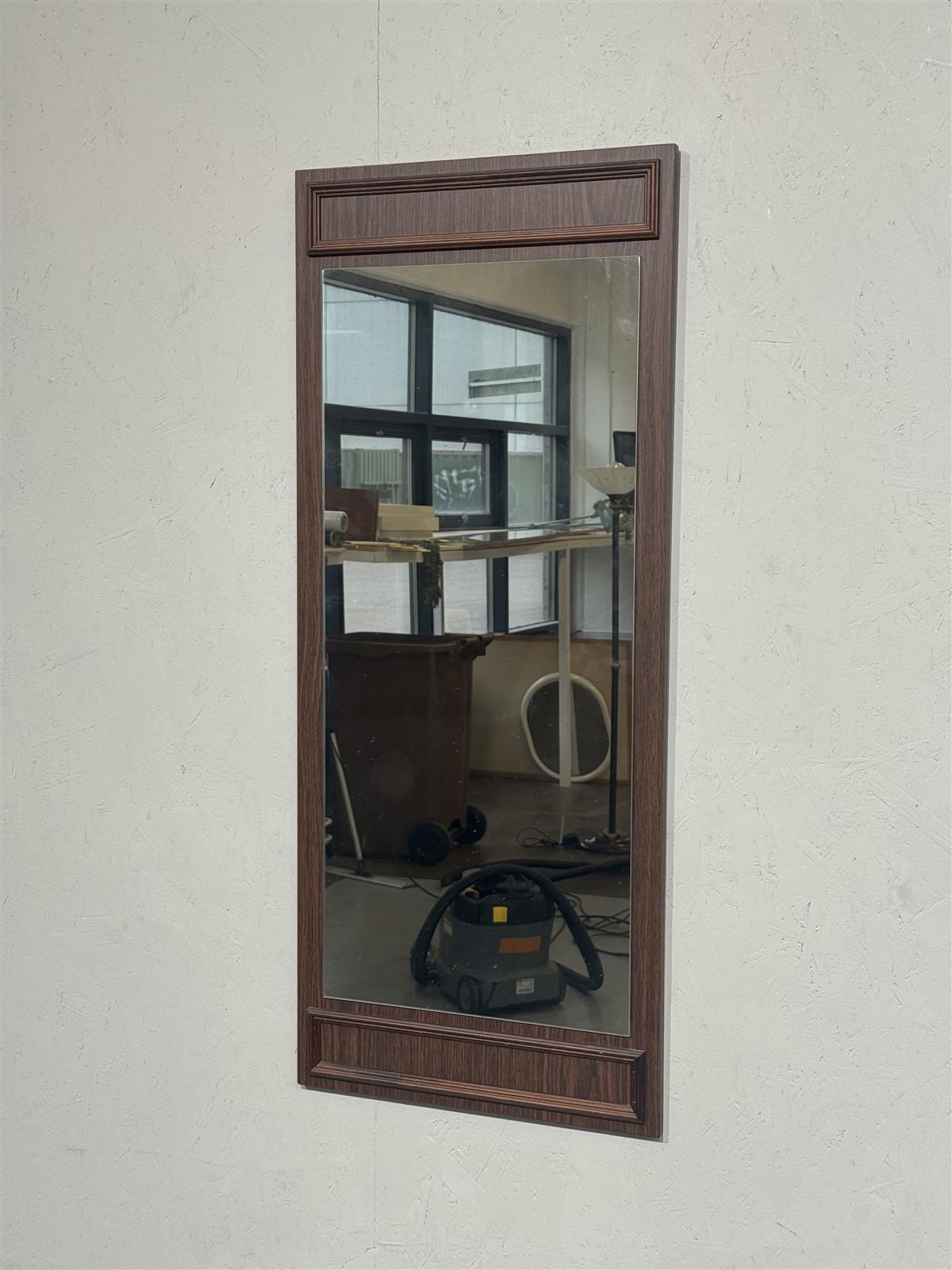 Suorakulmainen peili, jossa on tummanruskea puukehys. Kehyksessä on yksinkertainen koristeellinen uritus ylä- ja alareunassa, mikä antaa peilille hienostuneen ilmeen. Peili on suunniteltu seinälle ripustettavaksi ja se sopii hyvin monenlaisiin sisustustyyleihin. Kehyksen materiaali on todennäköisesti viilua, mikä antaa sille kestävän ja laadukkaan ulkonäön.