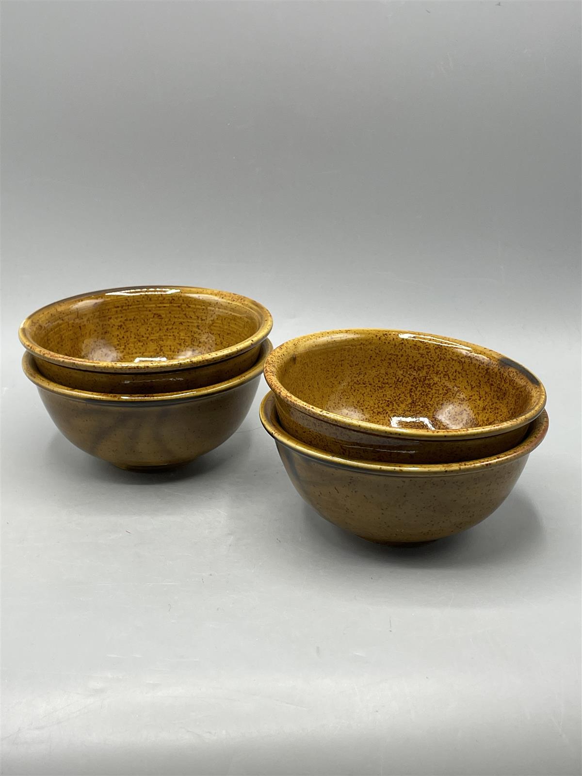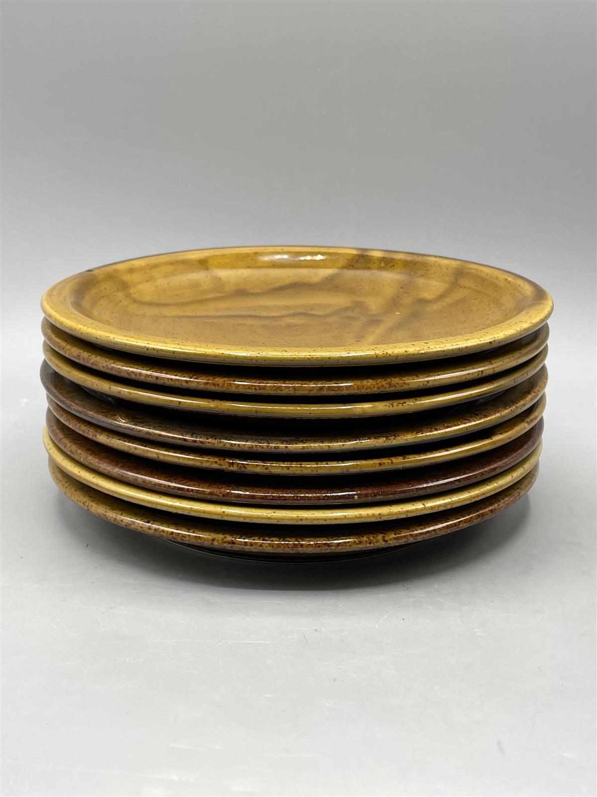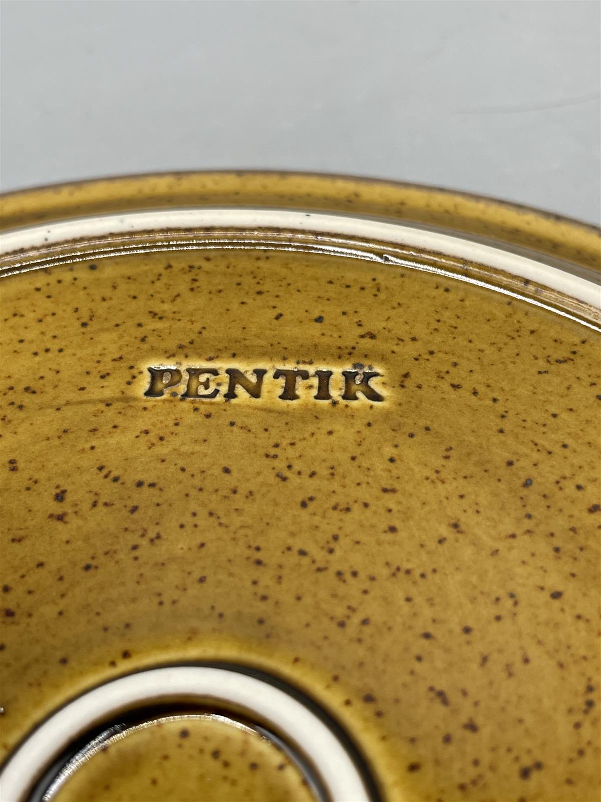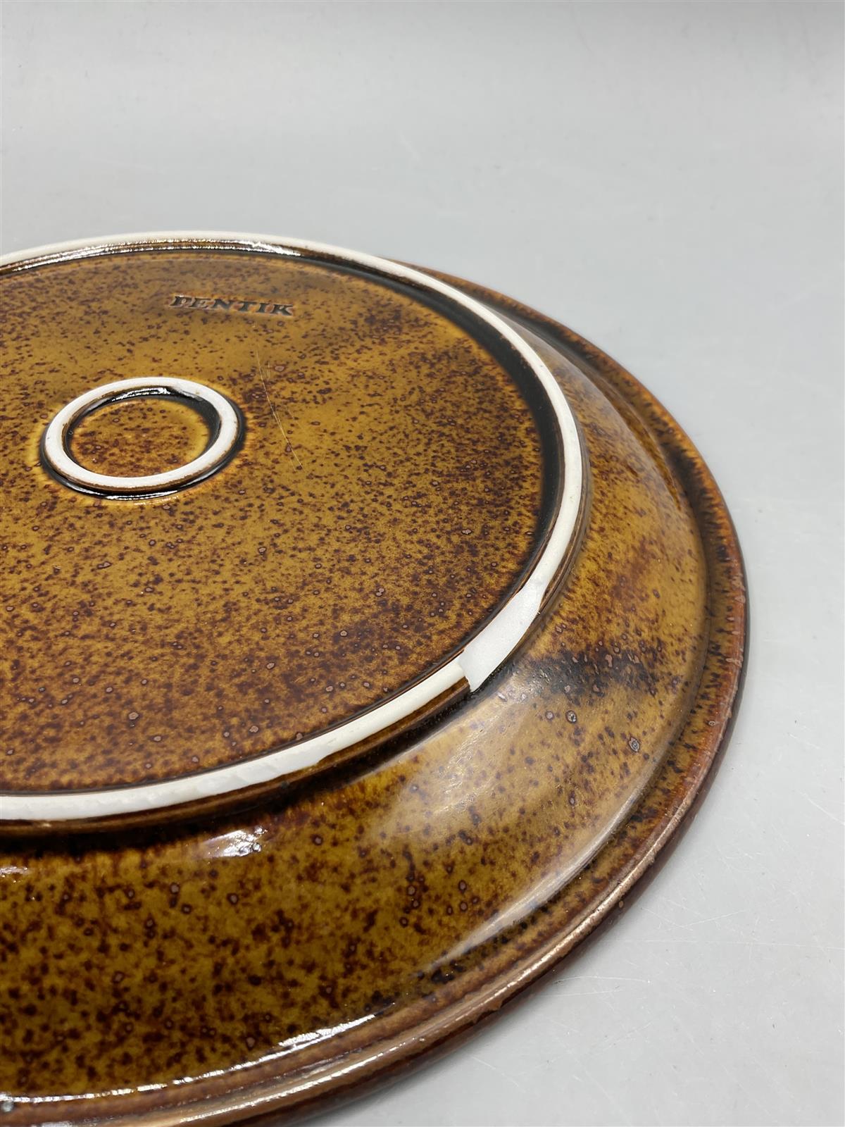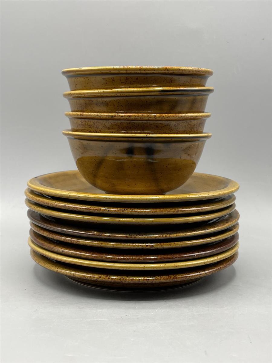 Pentik kulhot ja lautaset 12-osaa. 8kpl lautanen ja 4kpl kulho. Lautaset ja kulhot ovat ruskean sävyisiä ja niissä on pilkullinen kuviointi.