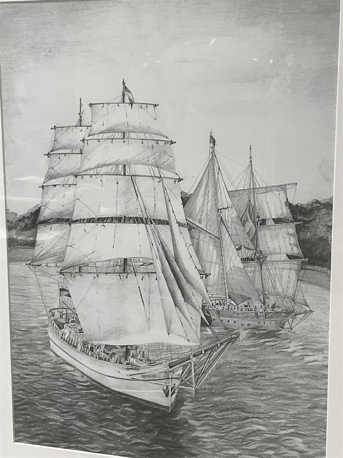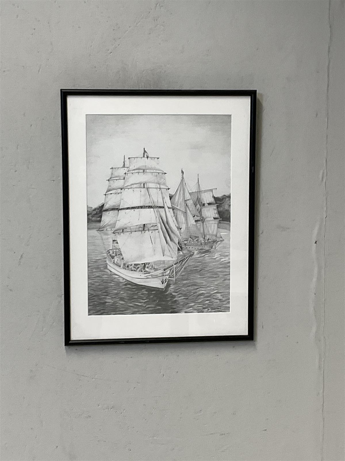Tyylikäs piirros, joka esittää kahta purjelaivaa merellä. Teos on signeerattu ja päivätty vuodelle 2000.