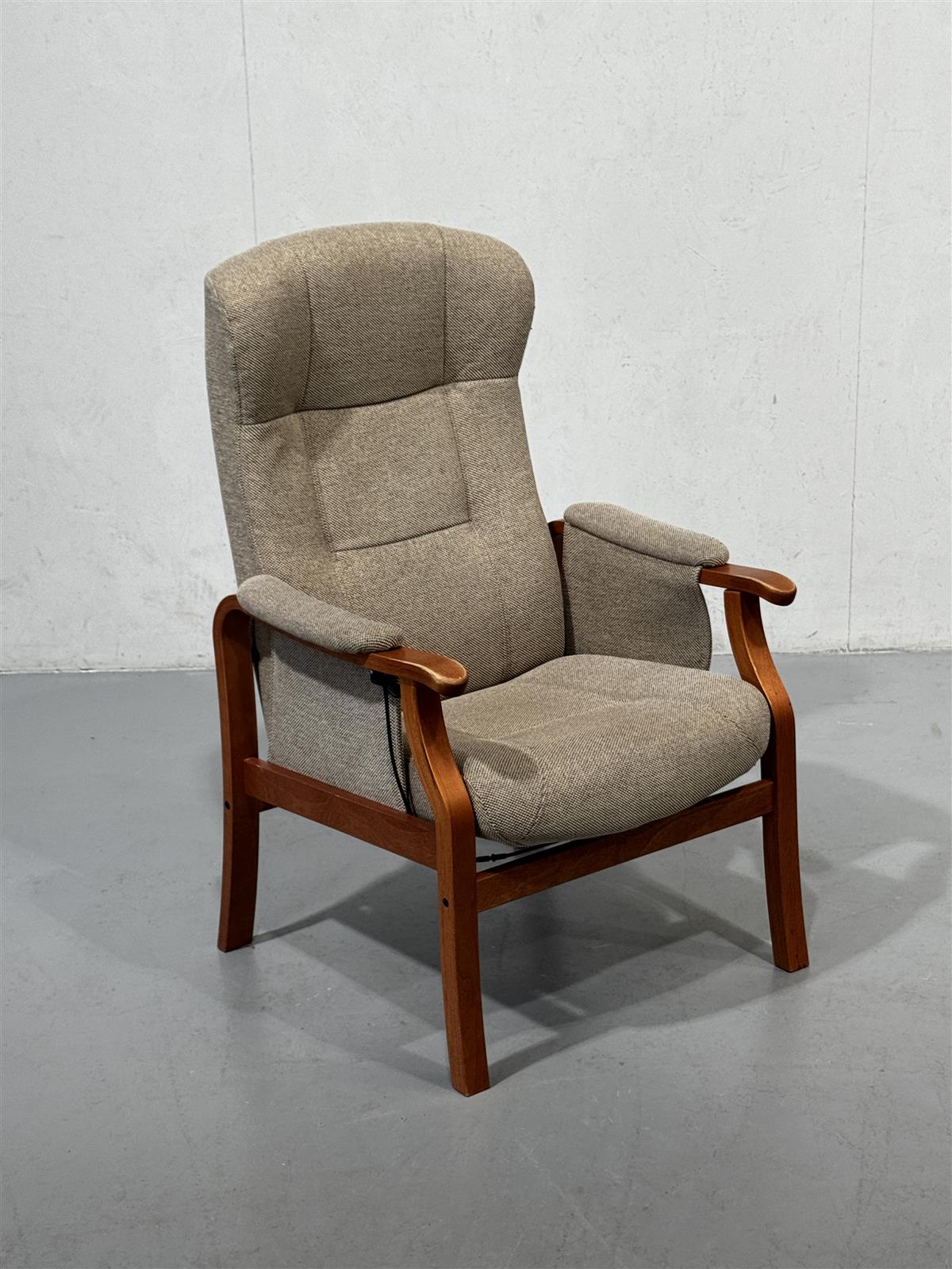 Mukava Pikku-Kippis nojatuoli, jossa on pehmeä verhoilu ja tukevat käsinojat. Tuolin selkänoja on korkea ja tarjoaa hyvän tuen istujalle. Painikkeella selkänojaa voi sätää taaksepäin.