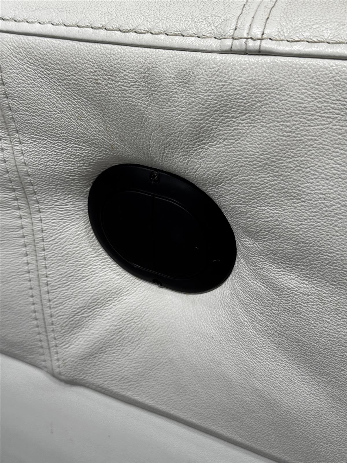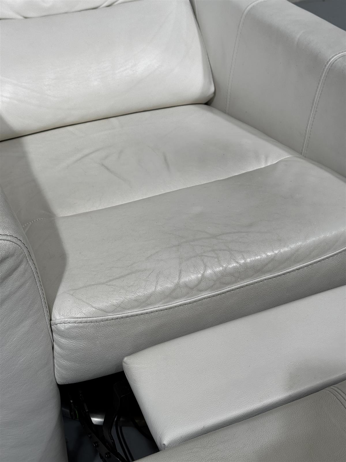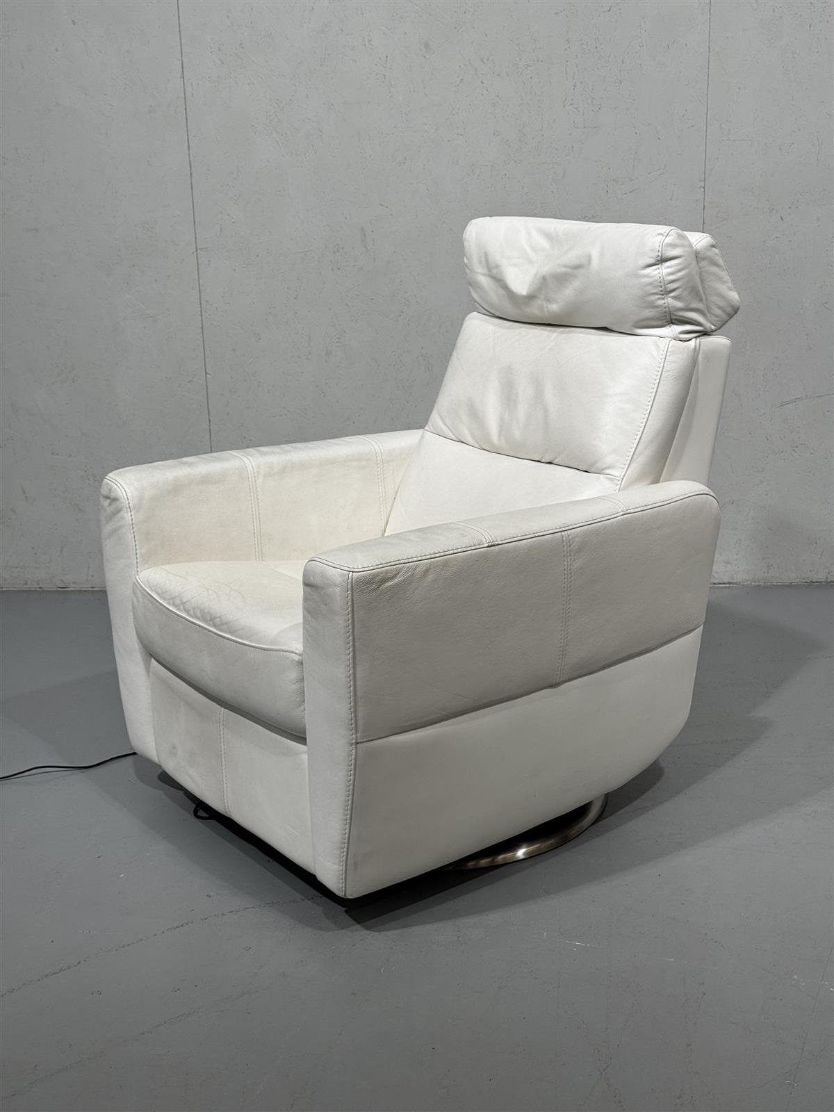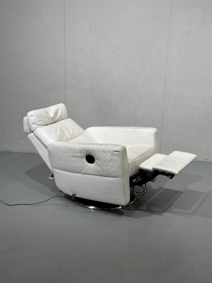 Valkoinen Pohjanmaan kaluste nahkaverhoiltu nojatuoli, jossa on sähköllä säädettävä jalkatuki, selkänoja sekä lisäksi pyörivä jalusta. Tuolissa on sähköinen mekanismi., painikkeet oikealla